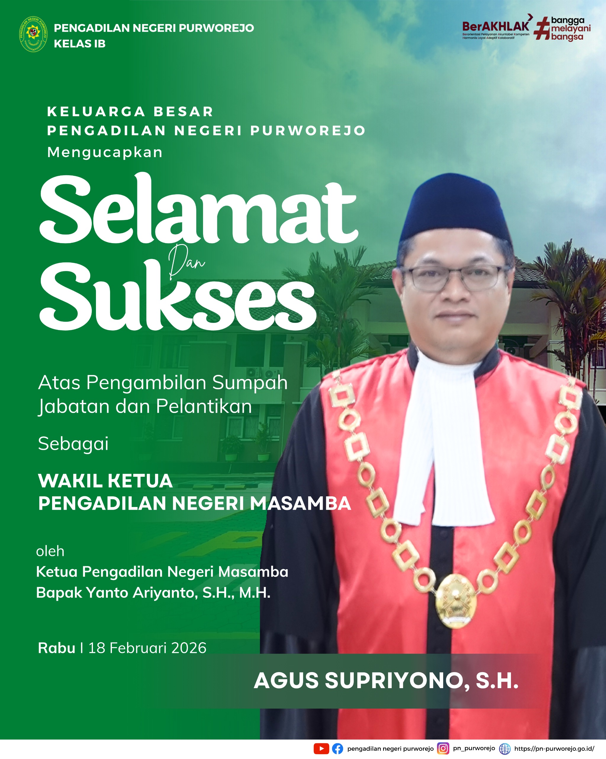 Keluarga Besar Pengadilan Negeri Purworejo mengucapkan Selamat dan Sukses atas Pengambilan Sumpah Jabatan dan Pelantikan Bapak Agus Supriyono, S.H. sebagai Waki Ketua Pengadilan Negeri Masamba oleh Ketua Pengadilan Negeri Masamba. Semoga selalu amanah dalam mengemban tugas.