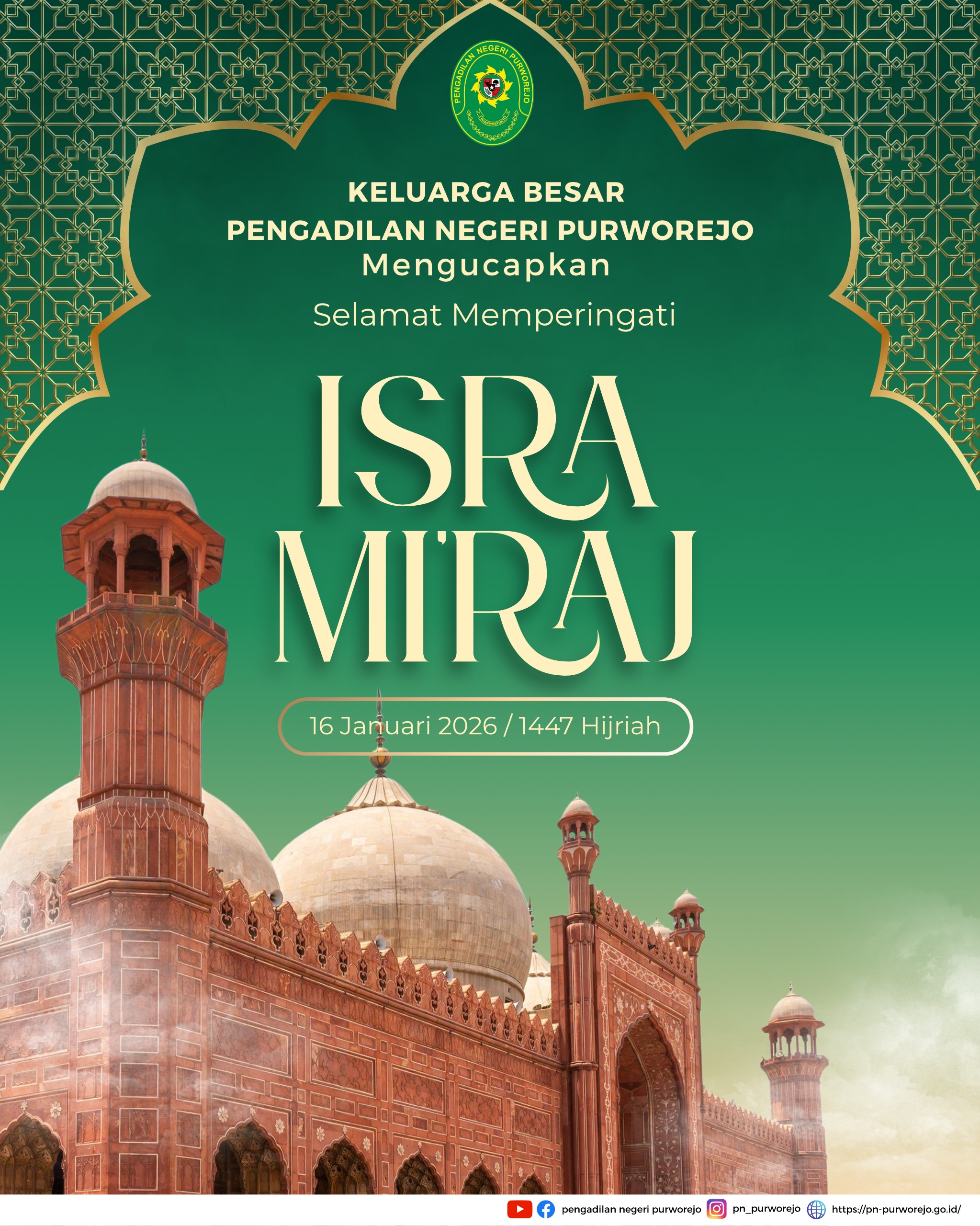 Keluarga Besar Pengadilan Negeri Purworejo mengucapkan Selamat Memperingati Isra Mi'raj Nabi Muhammad SAW 1447 H. Semoga kita senantiasa diberi keteguhan untuk meneladani akhlak Rasulullah SAW dalam kehidupan sehari-hari.