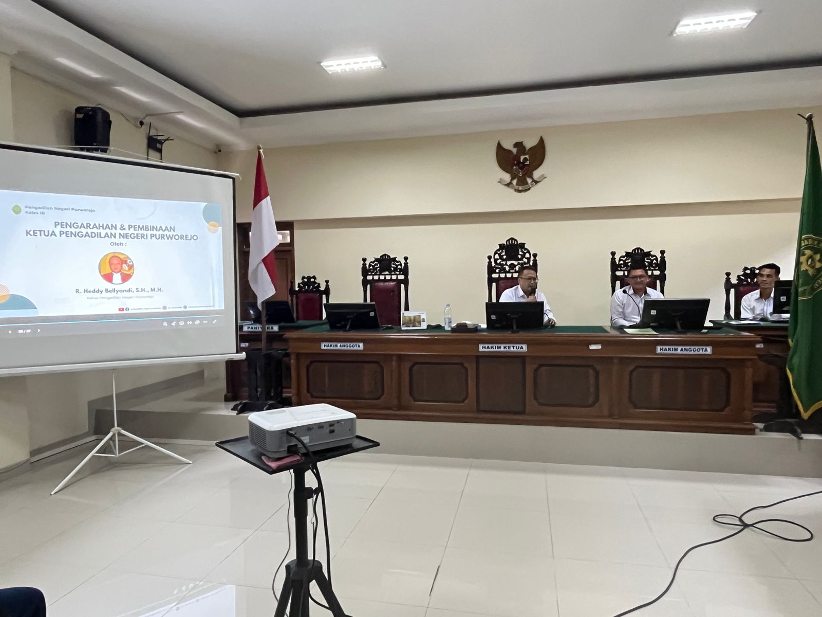 Purworejo - Senin, 20 Oktober 2025. Bertempat di Ruang Sidang Utama Pengadilan Negeri Purworejo telah dilaksanakan acara Rapat Evaluasi Kinerja Periode Bulan Oktober 2025 Pengadilan Negeri Purworejo yang dipimpin oleh Ketua Pengadilan Negeri Purworejo Bapak R. Heddy Bellyandi, S.H., M.H. didampingi Wakil Ketua Pengadilan Negeri Purworejo Bapak Hernawan, S.H., M.H. dan dihadiri oleh seluruh keluarga besar Pengadilan Negeri Purworejo. Rapat bulanan ini bertujuan untuk memonitor dan mengevaluasi kinerja organisasi selama satu bulan.
