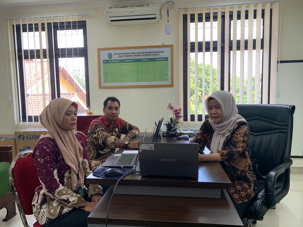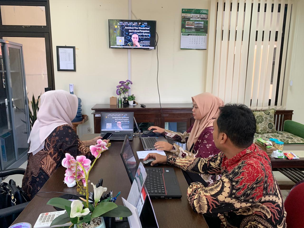 Purworejo - Kamis, 16 Oktober 2025. Sekretaris Pengadilan Negeri Purworejo Ibu Puspita Primavita, S.Kom. didampingi Kepala Sub Bagian Umum dan Keuangan serta jajarannya mengikuti Sosialisasi Fitur Standarisasi dan Evaluasi Pengadaan Menu Pengadaan Barang pada Aplikasi e-Sadewa secara daring bertempat di ruang kerja Sekretaris Pengadilan Negeri Purworejo.
