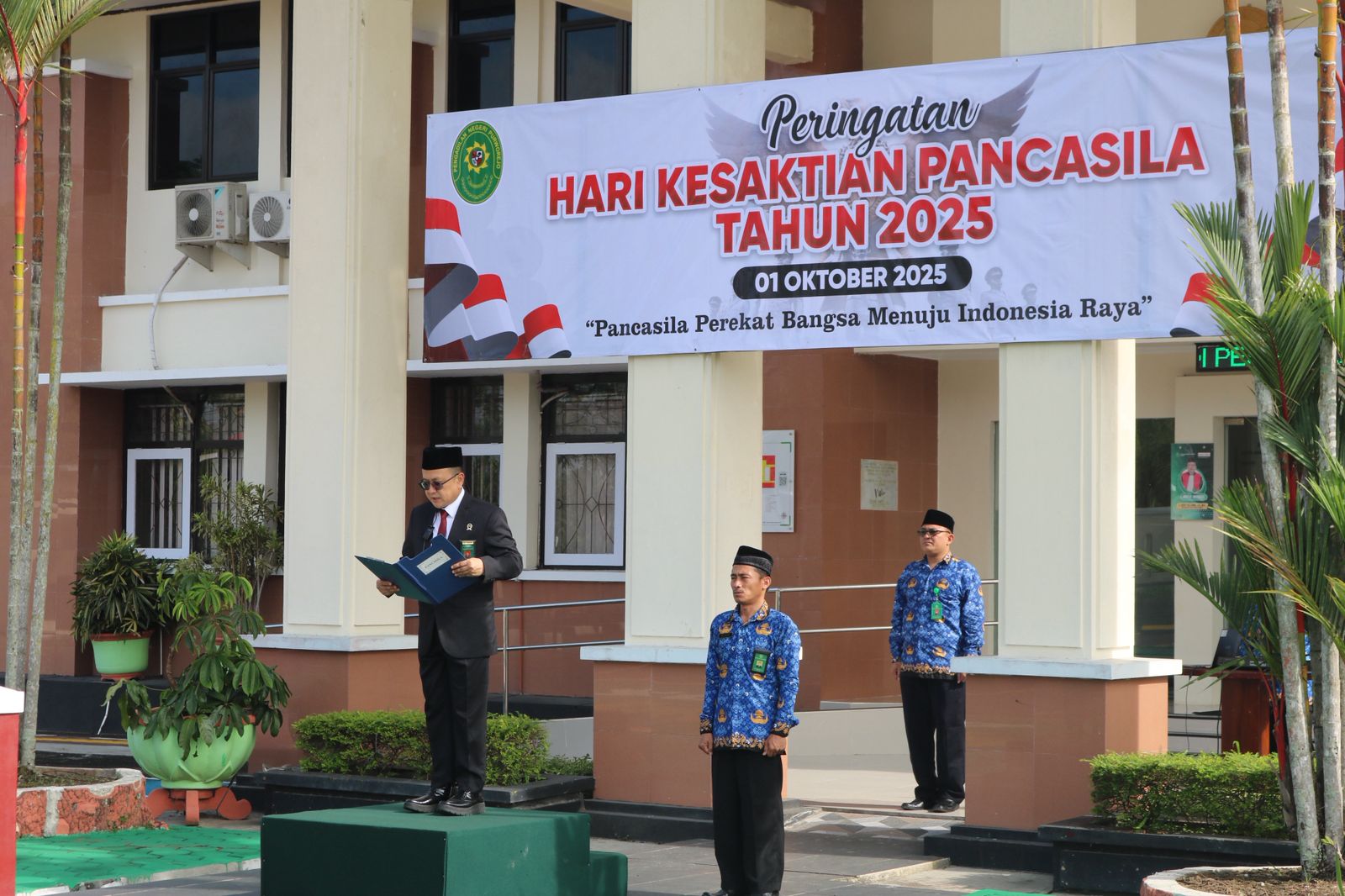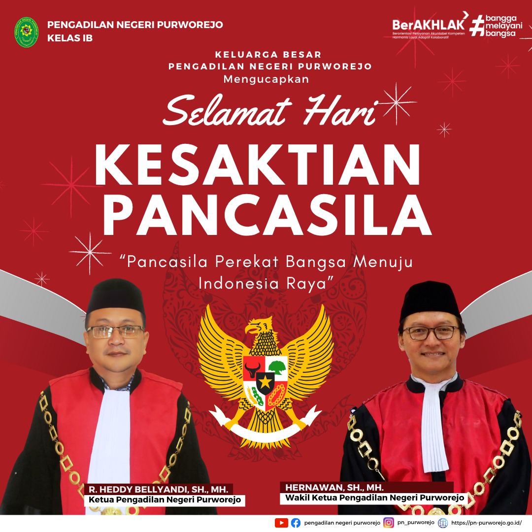 Purworejo - Rabu, 1 Oktober 2025. Pengadilan Negeri Purworejo melaksanakan Upacara memperingati Hari Kesaktian Pancasila 01 Oktober 2025 bertempat di Halaman Depan Kantor Pengadilan Negeri Purworejo. Kegiatan ini dipimpin oleh Ketua Pengadilan Negeri Purworejo Bapak R. Heddy Bellyandi, S.H., M.H. dan diikuti oleh seluruh Keluarga Besar Pengadilan Negeri Purworejo.
