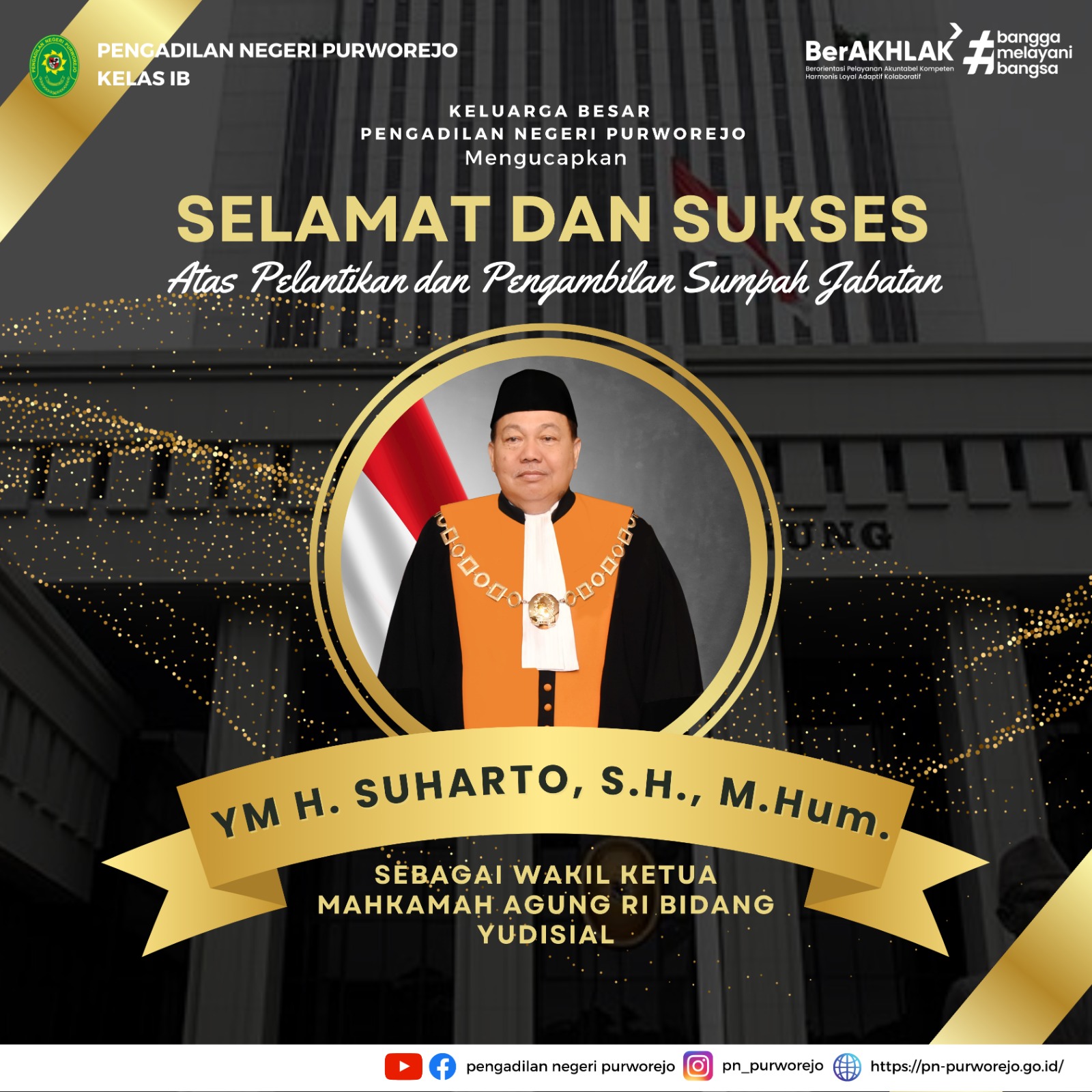 Keluarga Besar Pengadilan Negeri Purworejo mengucapkan Selamat dan Sukses atas Pelantikan dan Pengambilan Sumpah Jabatan YM bapak H. Suharto, S.H., M.Hum. sebagai Wakil Ketua Mahkamah Agung RI Bidang Yudisial.