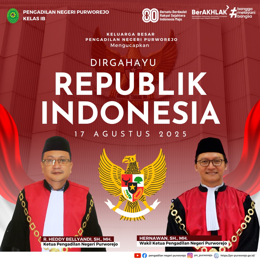 Purworejo - Minggu, 17 Agustus 2025. Pengadilan Negeri Purworejo melaksanakan Upacara Bendera Memperingati Hari Ulang Tahun Republik Indonesia Ke-80 Tahun di Halaman Depan Kantor Pengadilan Negeri Purworejo. Bertindak sebagai Pembina Upacara yaitu Wakil Ketua Pengadilan Negeri Purworejo Bapak Hernawan, S.H., M.H. dan dihadiri seluruh Keluarga Besar Pengadilan Negeri Purworejo.