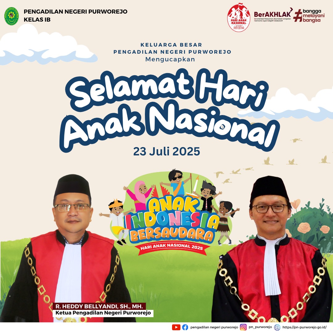 Keluarga Besar Pengadilan Negeri Purworejo mengucapkan Selamat Hari Anak Nasional. Anak Indonesia Bersaudara.