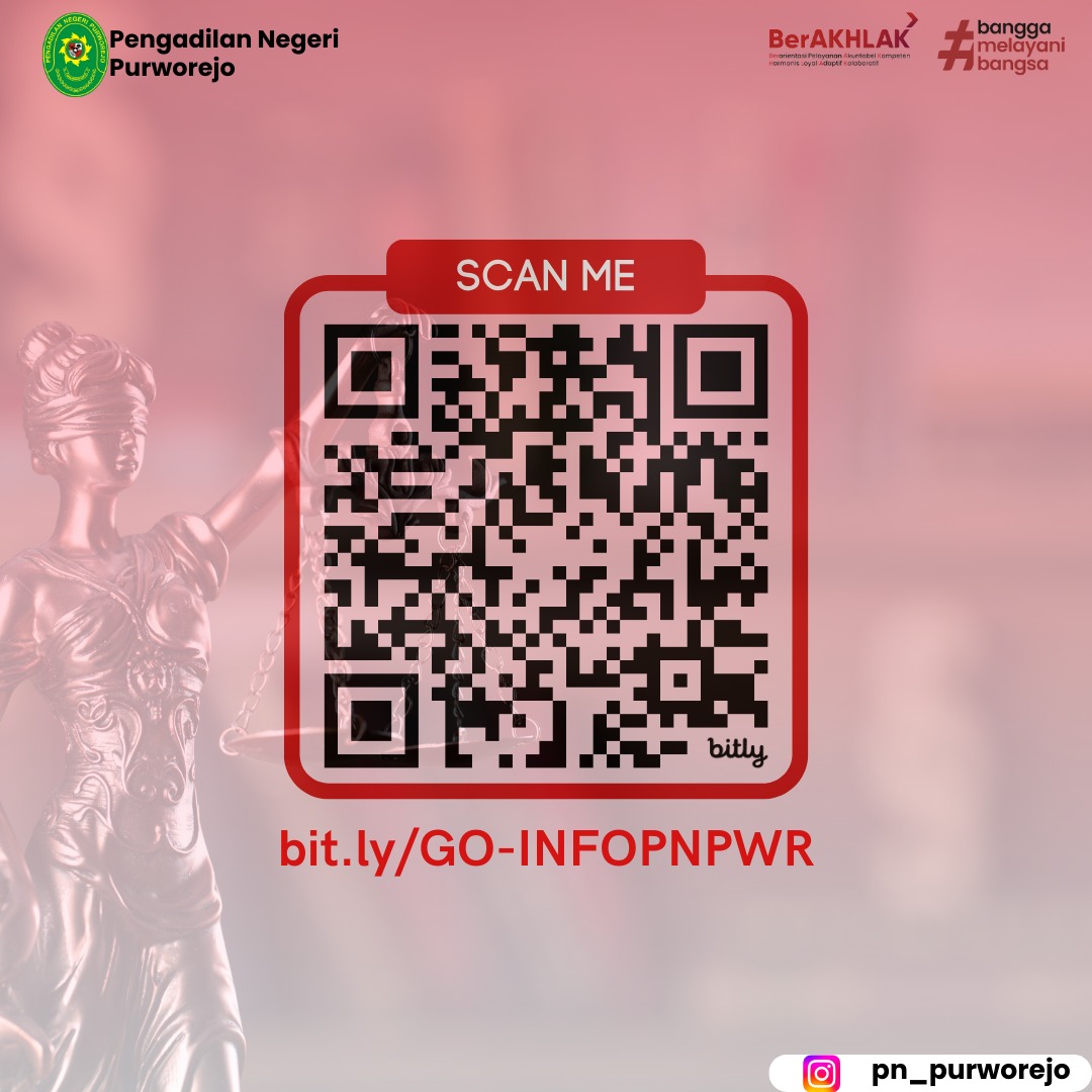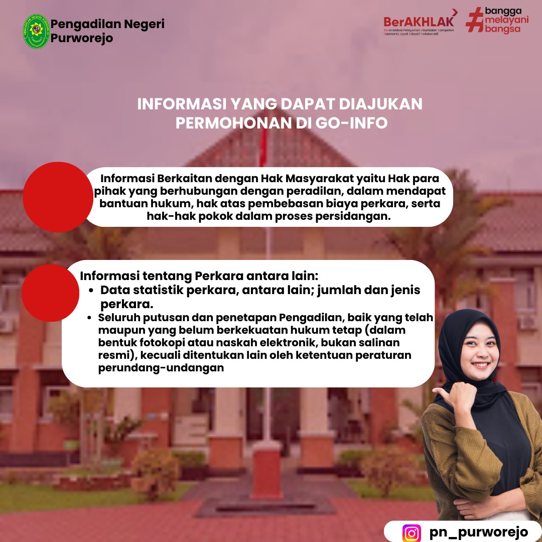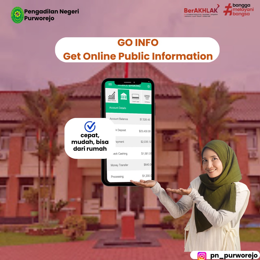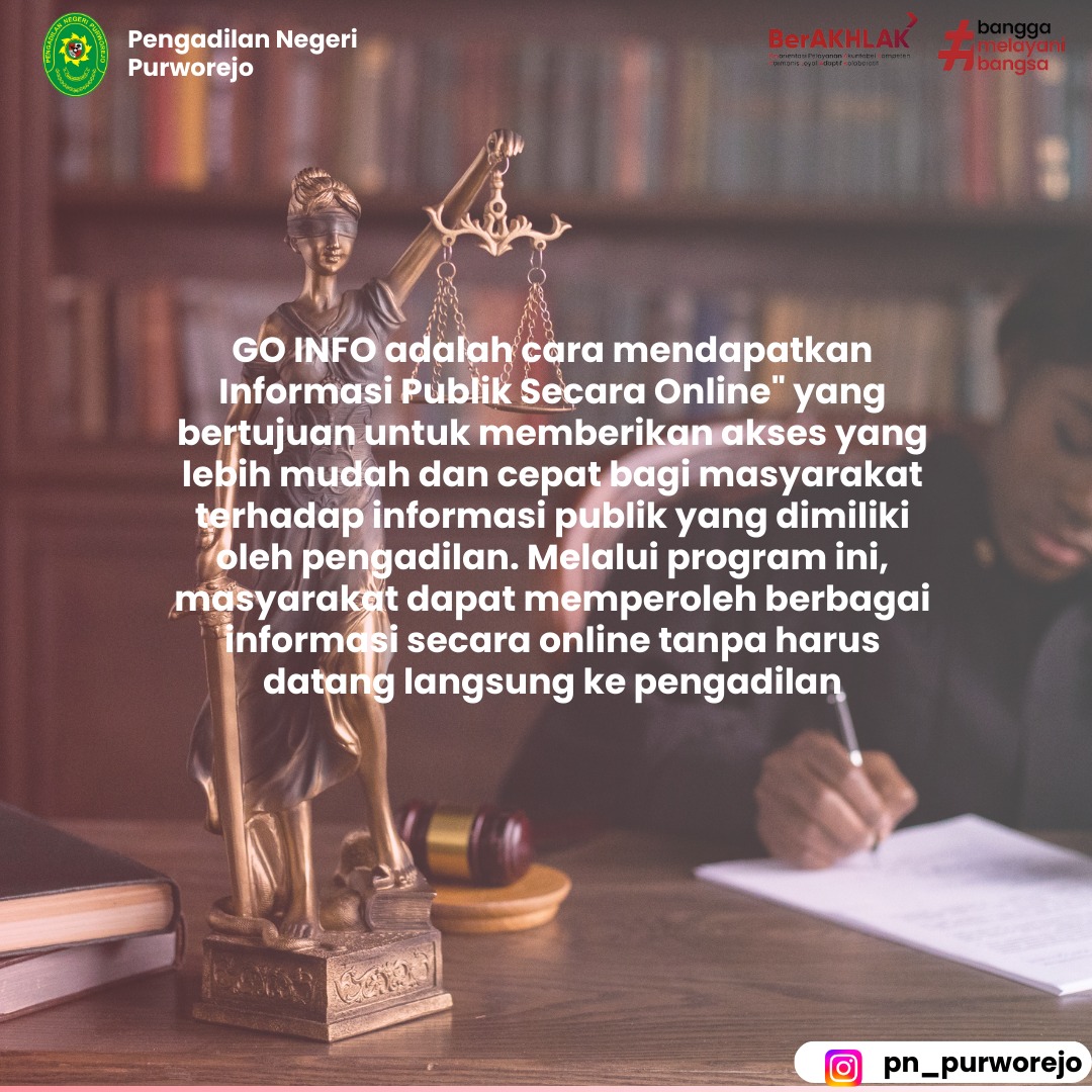 Dalam rangka memaksimalkan Fungsi ASN sebagai pelayan publik yang memberikan pelayanan prima kepada masyarakat, Pengadilan Negeri Purworejo menghadirkan GO INFO (Get Online Public Information) sebagai langkah digitalisasi permohonan informasi publik online yang bertujuan untuk memberikan akses yang lebih mudah dan cepat bagi masyarakat terhadap informasi publik yang dimiliki oleh pengadilan. Melalui program ini, masyarakat dapat memperoleh berbagai informasi secara online tanpa harus datang langsung ke pengadilan. Informasi yang dapat diperoleh melalui GO INFO yaitu