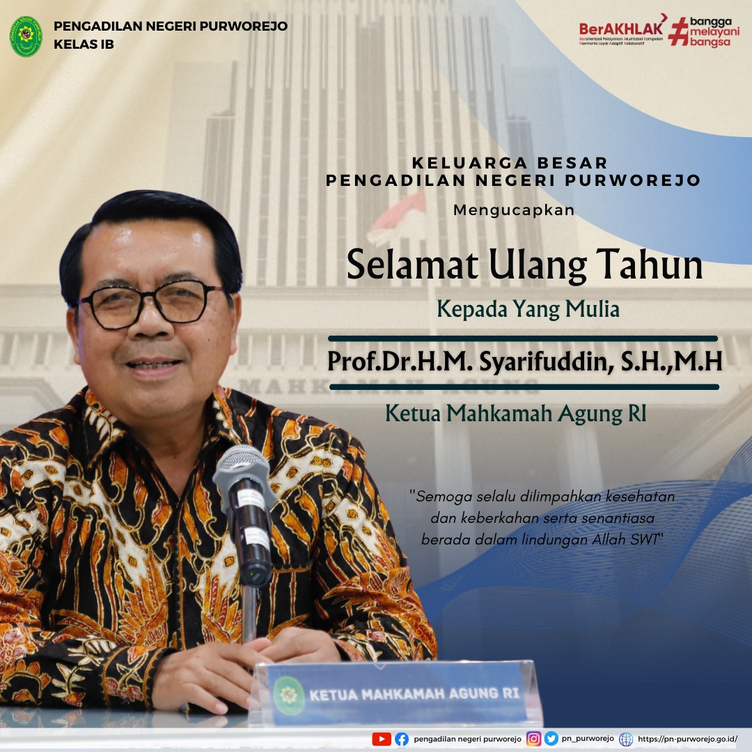 Keluarga Besar Pengadilan Negeri Purworejo mengucapkan Selamat Ulang Tahun ke 70 Kepada Ketua Mahkamah Agung Republik Indonesia Yang Mulia Bapak Prof. Dr. H. M. Syarifuddin, S.H., M.H. "Semoga selalu dilimpahkan kesehatan dan keberkahan serta senantiasa berada dalam lindungan Allah SWT".