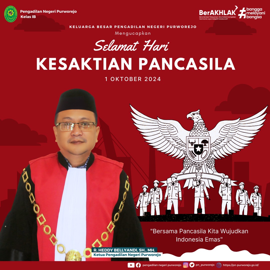 Purworejo – Selasa, 1 Oktober 2024. Pengadilan Negeri Purworejo melaksanakan Upacara Peringatan Hari Kesaktian Pancasila bertempat di halaman depan Kantor Pengadilan Negeri Purworejo. Upacara ini dipimpin oleh Plh. Ketua Pengadilan Negeri Purworejo Bapak Agus Supriyono, S.H. dan diikuti oleh seluruh Keluarga Besar Pengadilan Negeri Purworejo.