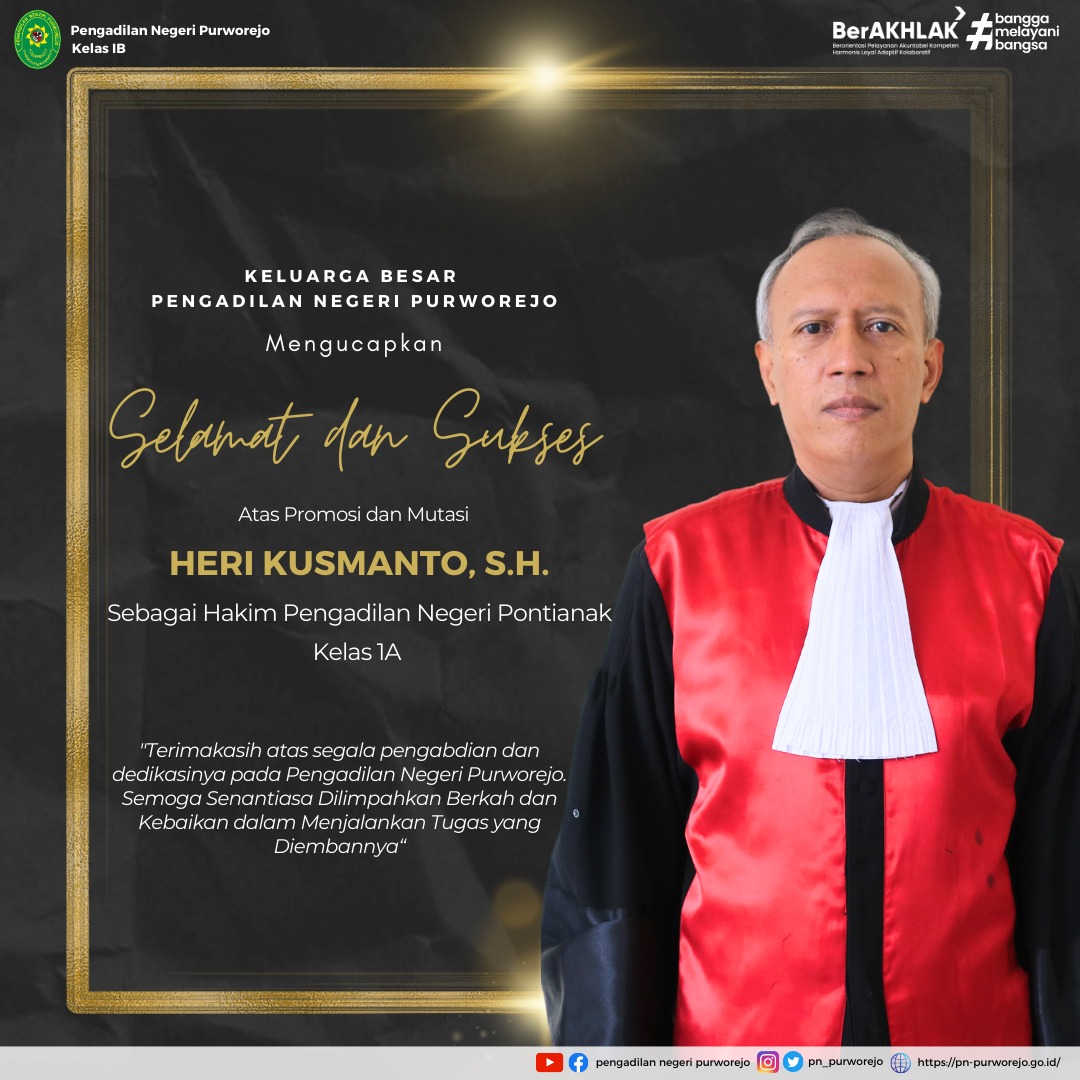 Keluarga Besar Pengadilan Negeri mengucapkan Selamat dan Sukses atas Promosi dan Mutasi Bapak Purnomo Hadiyarto, S.H. sebagai Hakim Pengadilan Negeri Surabaya Kelas 1A Khusus.