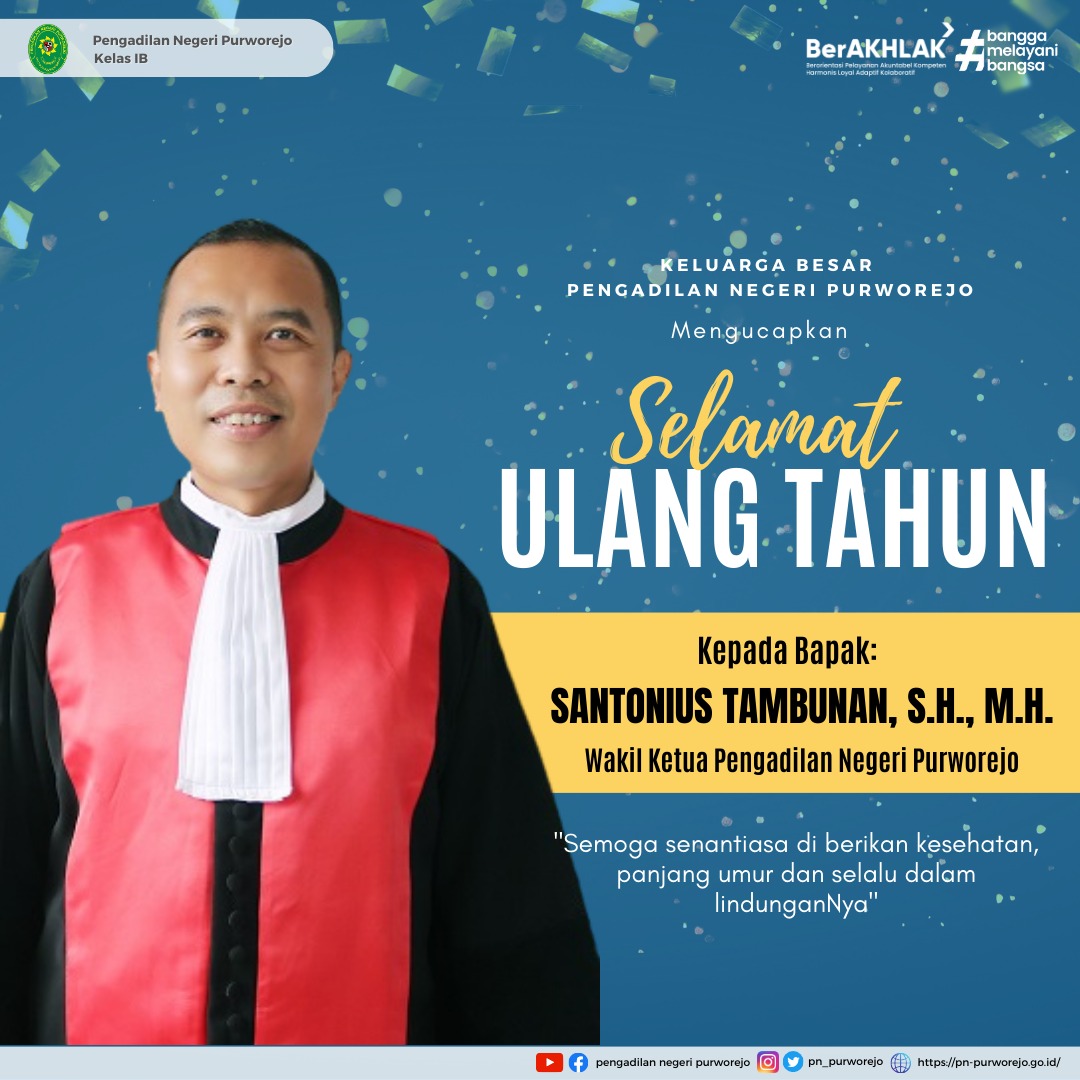 Keluarga Besar Pengadilan Negeri Purworejo mengucapkan Selamat Ulang Tahun kepada Wakil Ketua Pengadilan Negeri Purworejo Bapak Santonius Tambunan, S.H., M.H.. Semoga senantiasa di berikan kesehatan, panjang umur dan selalu dalam lindunganNya.