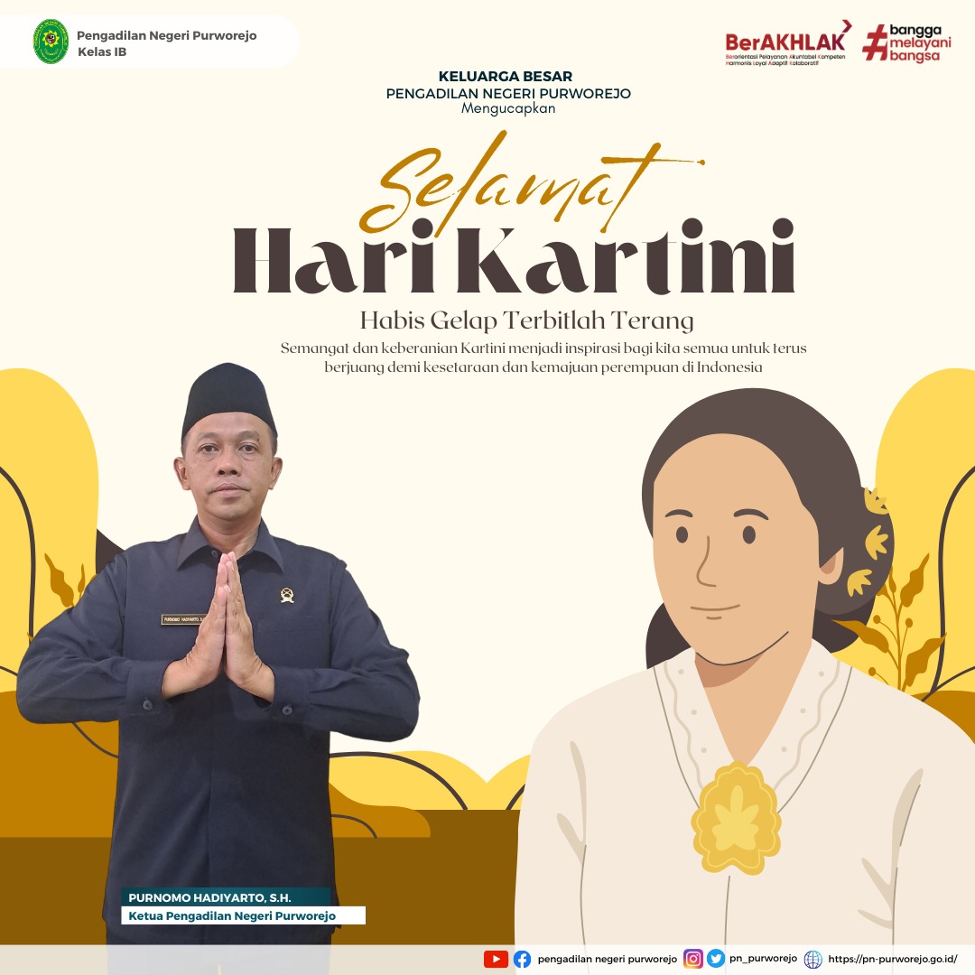 Keluarga Besar Pengadilan Negeri Purworejo mengucapkan Selamat Hari Kartini. Habis Gelap Terbitlah Terang . Semangat dan keberanian Kartini menjadi inspirasi bagi kita semua untuk terus berjuang demi kesetaraan dan kemajuan perempuan di Indonesia.