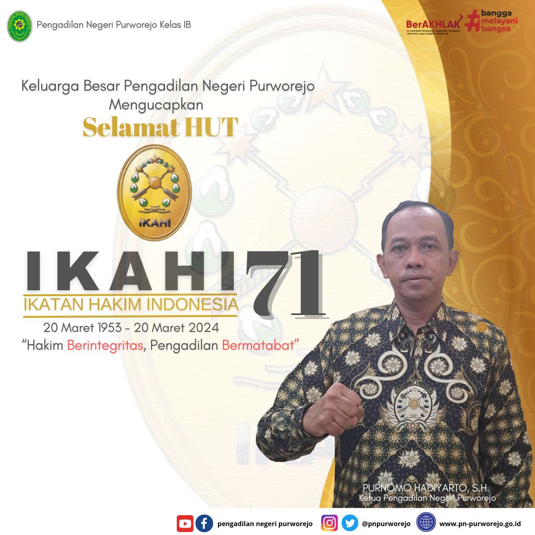 Keluarga Besar Pengadilan Negeri Purworejo Mengucapkan Selamat Hari Ulang Tahun Ikatan Hakim Indonesia (IKAHI) ke -71. Hakim Berintegritas, Pengadilan Bermartabat.