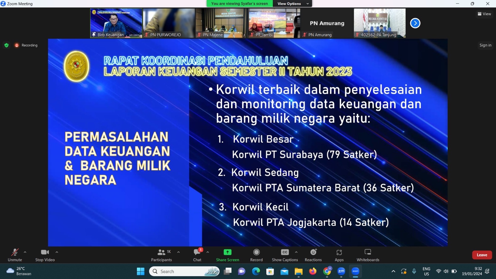 Purworejo – Jumat, 19 Januari 2024. Kepala Sub Bagian Umum dan Keuangan Ibu Hesti Srieyanti, S.H. dan Staf Pengelola Keuangan mengikuti Rapat Pendahuluan Persiapan Penyusunan Laporan Keuangan Tahun 2023 (Unaudited) secara virtual.