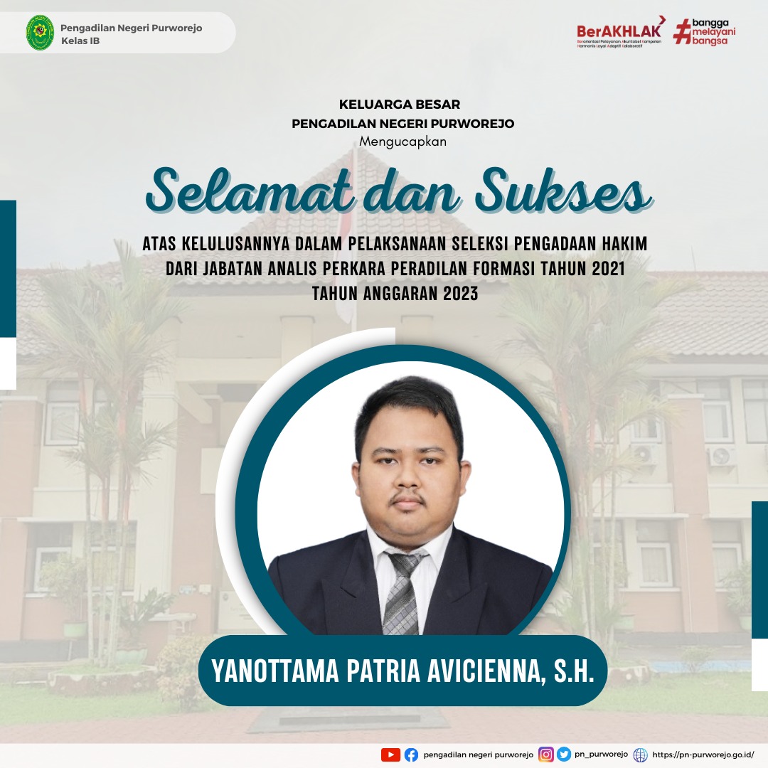 Keluarga Besar Pengadilan Negeri Purworejo Selamat dan Sukses Atas Kelulusannya dalam Pelaksanaan Seleksi Pengadaan Hakim dari Jabatan Analis Perkara Peradilan Formasi Tahun 2021 Tahun Anggaran 2023 an Yanottama Patria Avicienna, S.H..