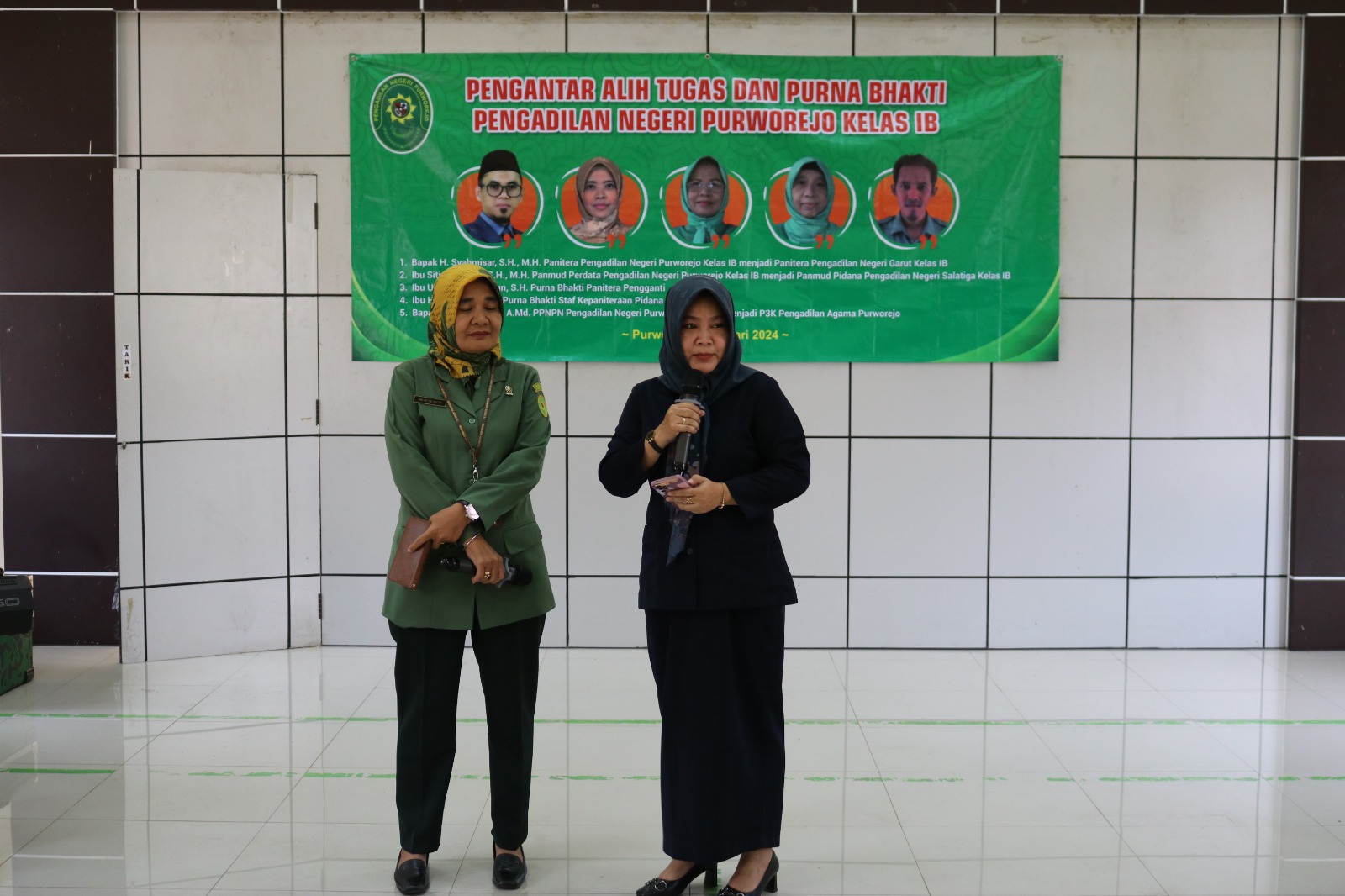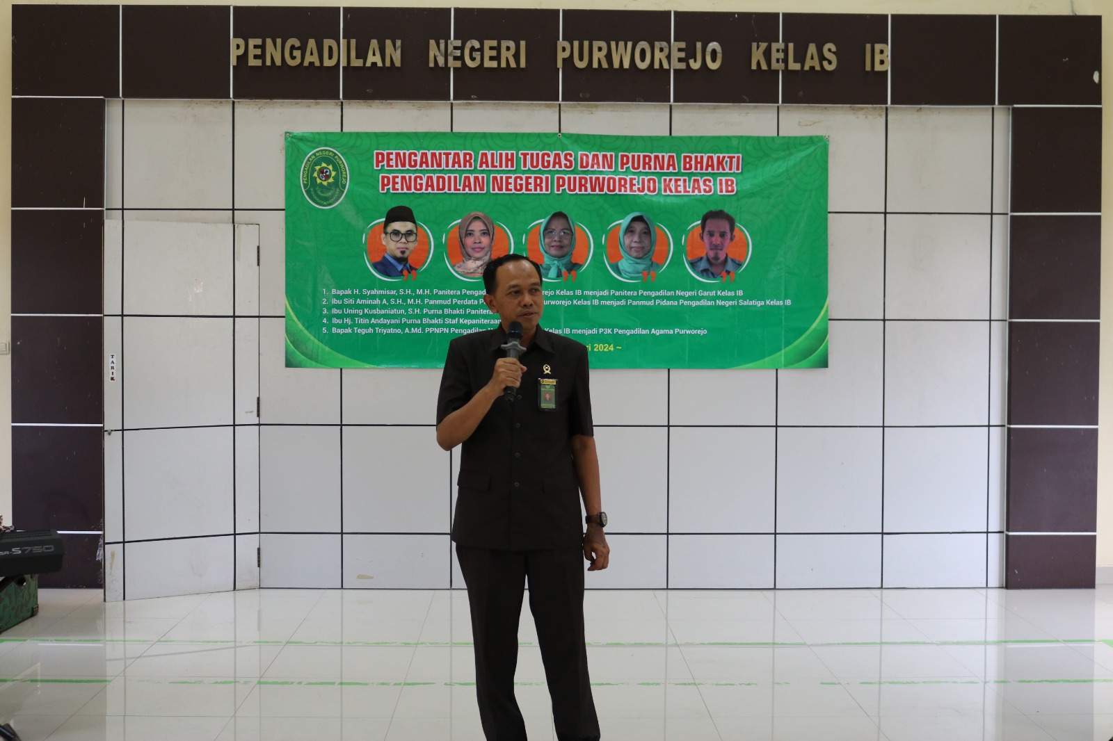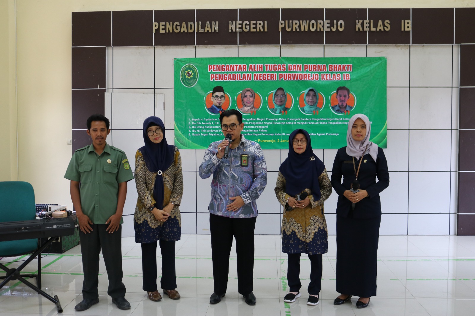 Purworejo – Selasa, 2 Januari 2024. Pengadilan Negeri Purworejo mengadakan Pengantar Alih Tugas Pengantar Purna Bakti Bapak Syahmisar, S.H., M.H., Ibu Siti Aminah A, S.H., Ibu Uning Kusbaniatun, Ibu Titin Andayani dan Bapak Teguh Triyatno, A.Md. yang bertempat di Aula Pengadilan Negeri Purworejo.
