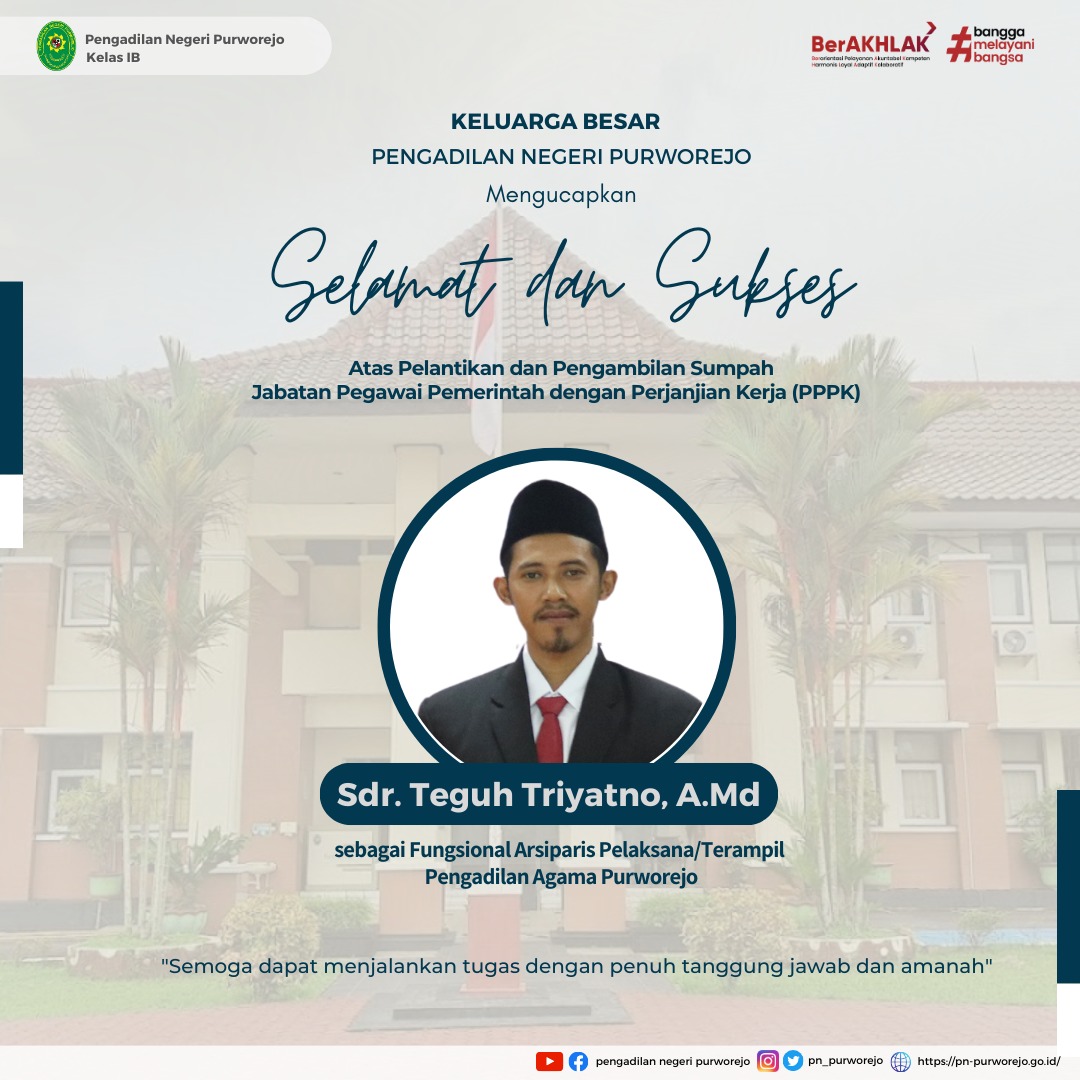 Keluarga Besar Pengadilan Negeri Purworejo mengucapkan Selamat dan Sukses atas Pelantikan dan Pengambilan Sumpah Jabatan Pegawai Pemerintah dengan Perjanjian Kerja (PPPK) kepada Sdr. Teguh Triyatno, A.Md. sebagai Fungsional Arsiparis Pelaksana/Terampil Pengadilan Agama Purworejo. Semoga dapat menjalankan tugas dengan penuh tanggungjawab dan amanah.