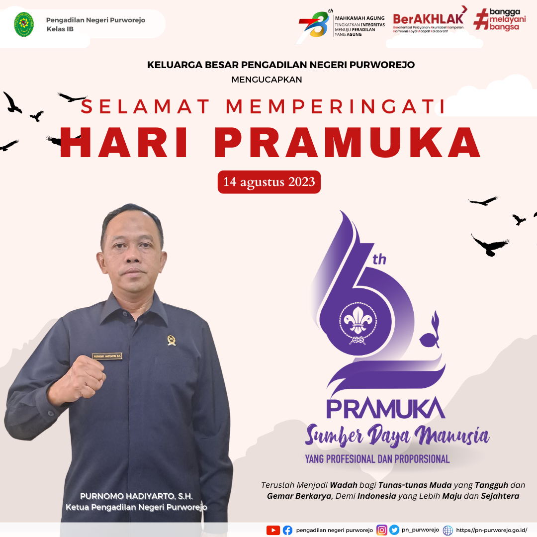 Purworejo – Senin, 14 Agustus 2023. Keluarga besar Pengadilan Negeri Purworejo mengucapkan Selamat Memperingati Hari Pramuka “Sumber Daya Manusia yang Profesional dan Proporsional”.