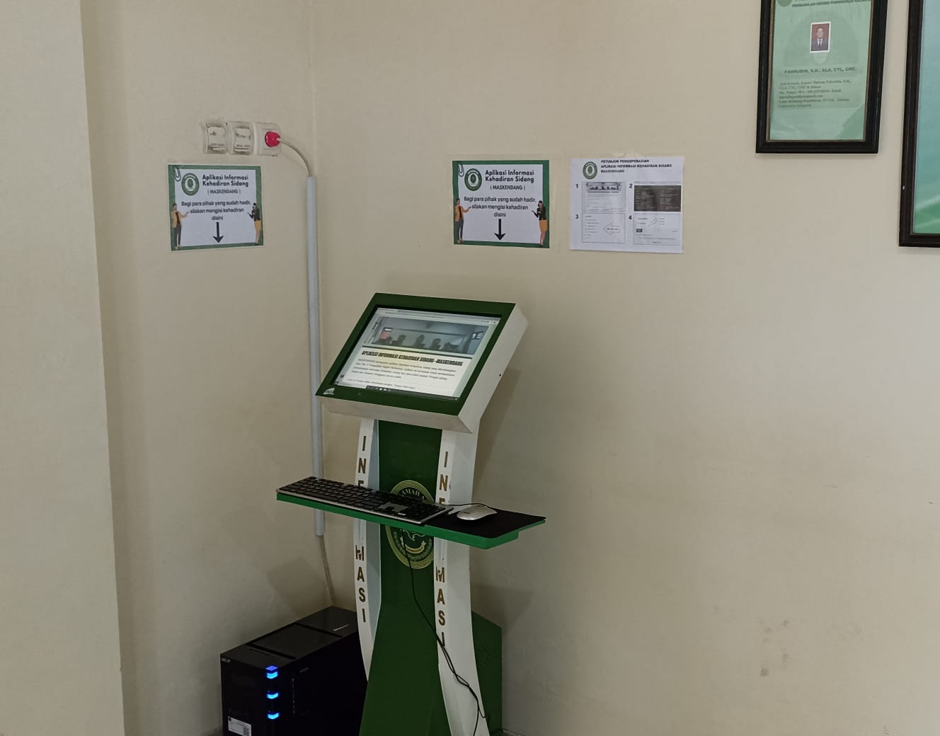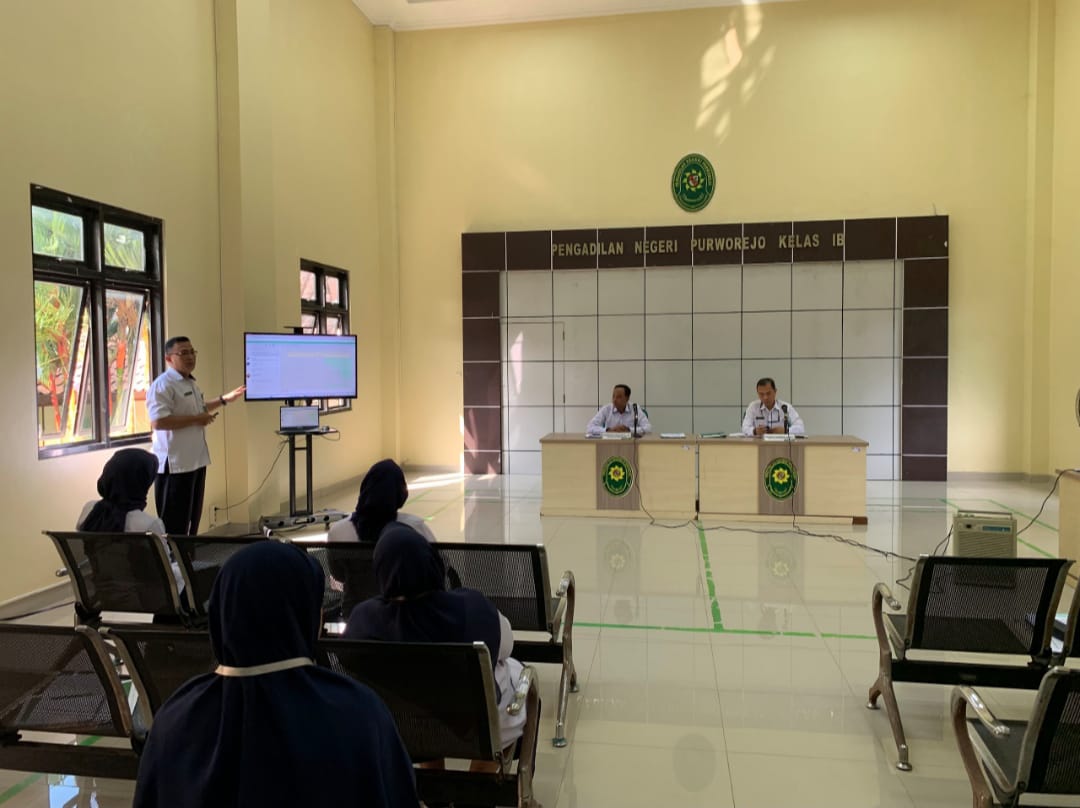 Purworejo - Pada hari Senin, 26 Juni 2023 dilakukan Sosialisasi Aplikasi Informasi Kehadiran Sidang (MASKENDANG). Aplikasi ini bertujuan untuk memudahkan penyampaian informasi kehadiran sidang dari para pihak kepada Petugas Sidang, Hakim dan Panitera Pengganti secara online. Para pihak yang biasanya menyampaikan informasi kehadiran secara lisan kepada petugas sidang yang kemudaian diteruskan kepada Hakim dan Panitera Pengganti dengan Aplikasi MASKENDANG ini cukup mengisi data diri dan nomor perkara pada sebuah mesin aplikasi yang disediakan diruang tunggu sidang maka kehadiran para pihak sudah tercatat dan ternoifikasi kepada Hakim dan Panitera Pengganti. Dengan aplikasi ini diharapkan mampu memgurangi waktu tunggu persidangan di Pengadilan Negeri Purworejo.