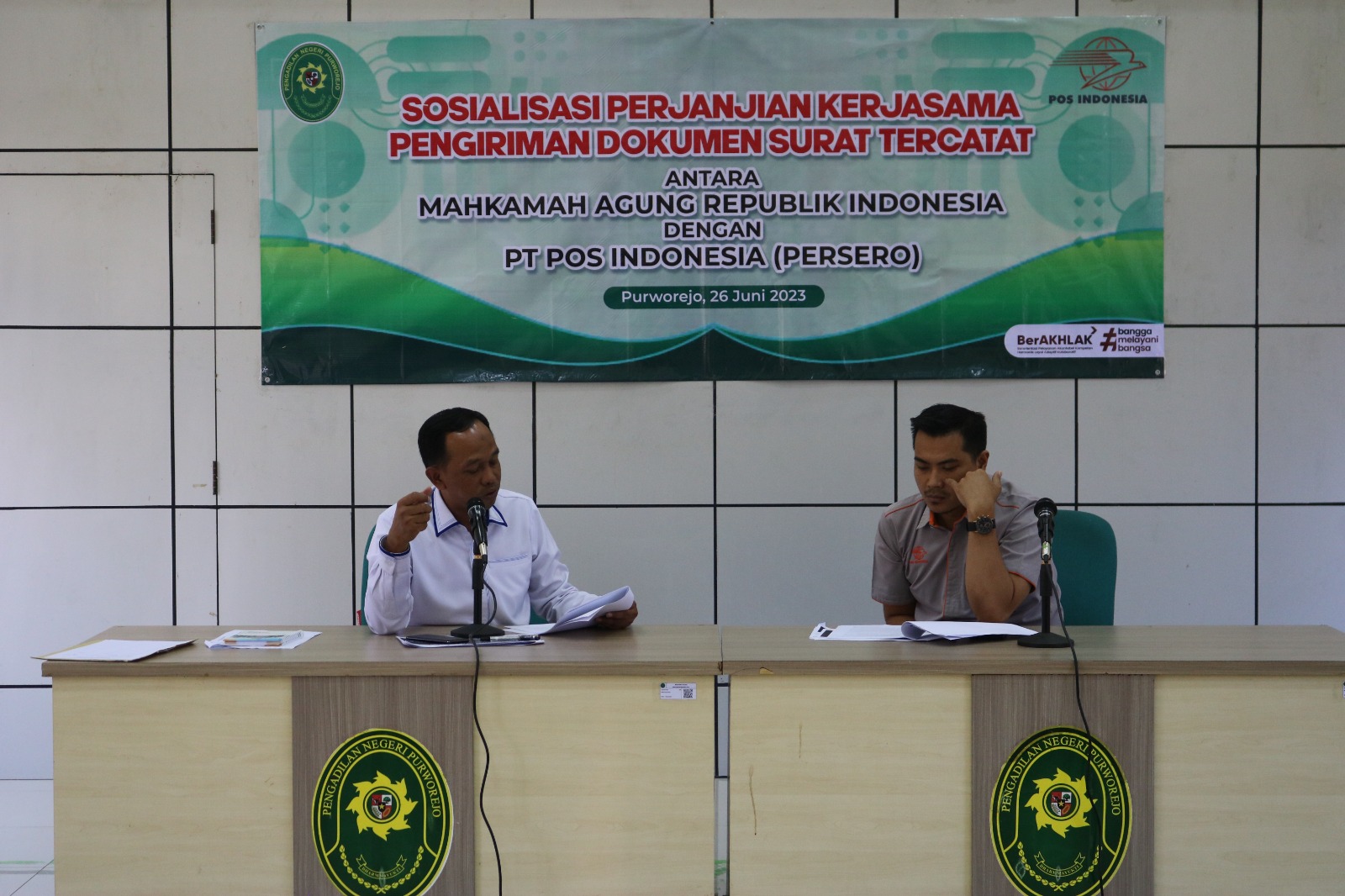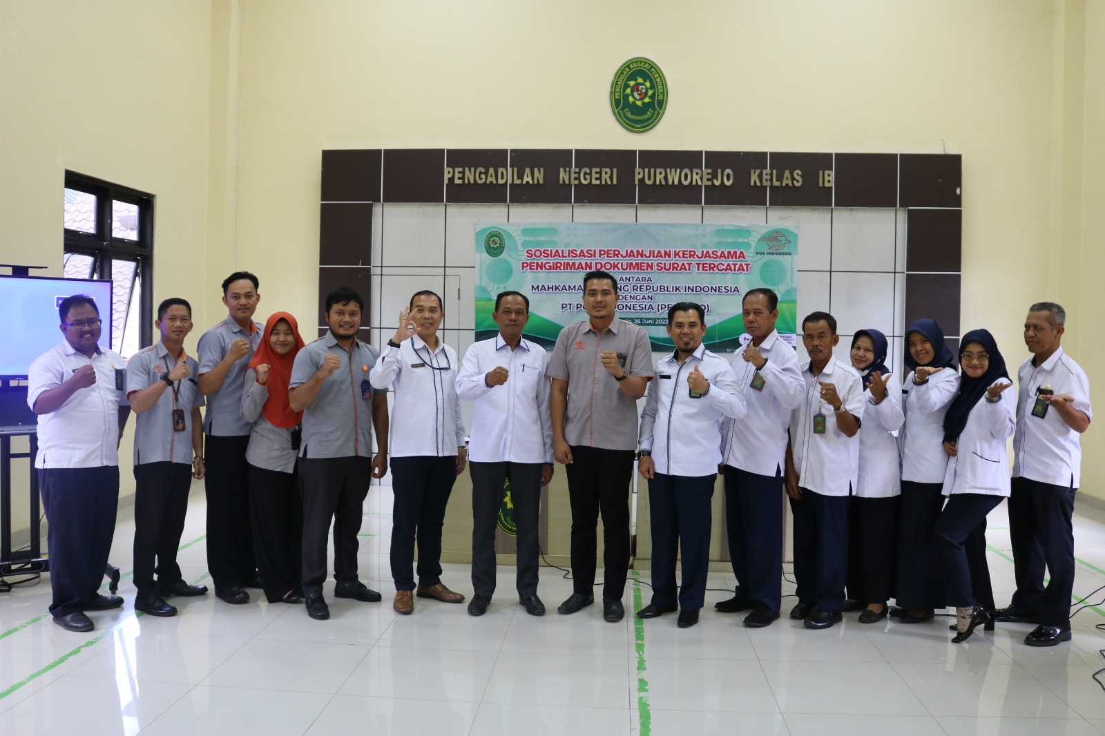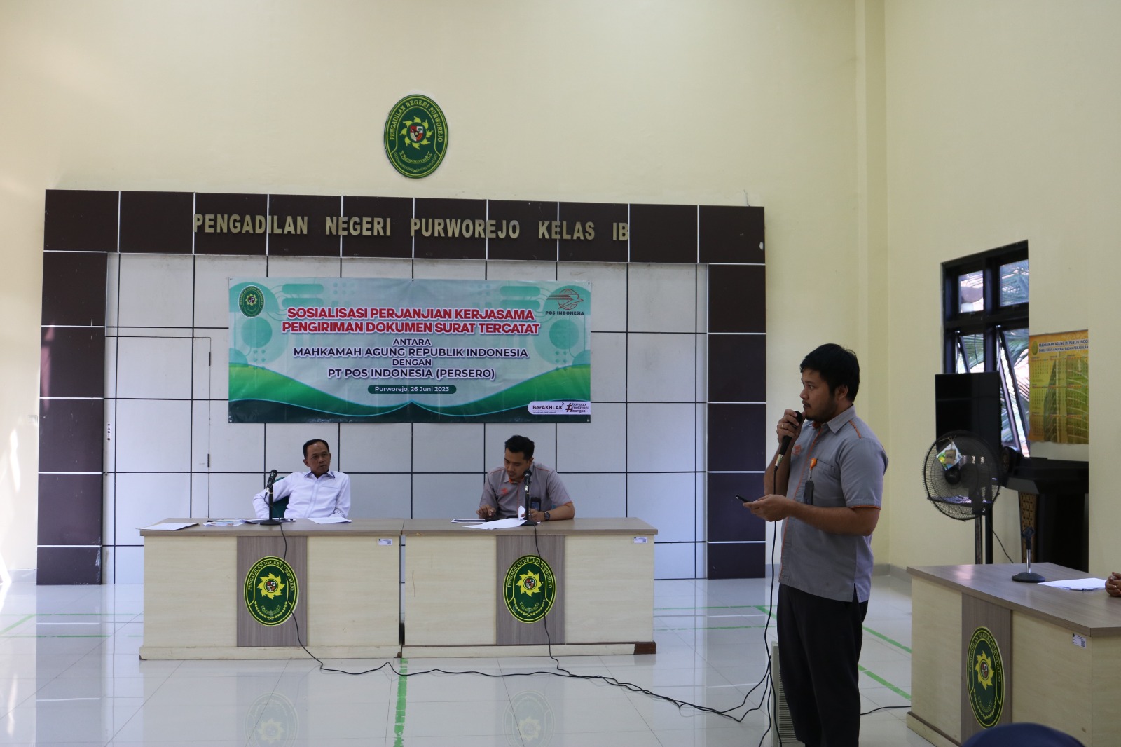 Purworejo - Senin, 26 Juni 2023. Bertempat di aula Pengadilan Negeri Purworejo telah dilaksanakan acara Sosialisasi Perjanjian Kerjasama Pengiriman Dokumen Surat Tercatat Mahkamah Agung RI dengan PT POS Indonesia.
