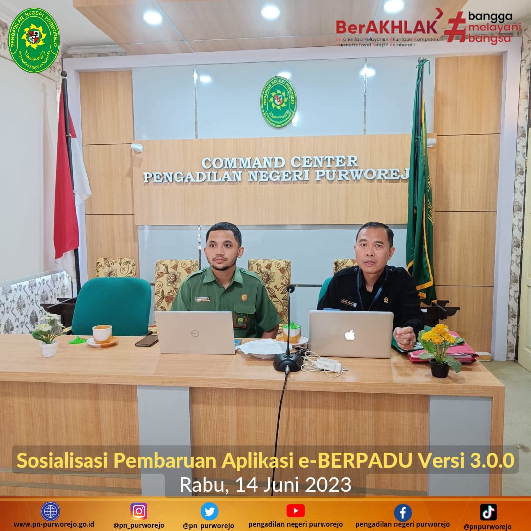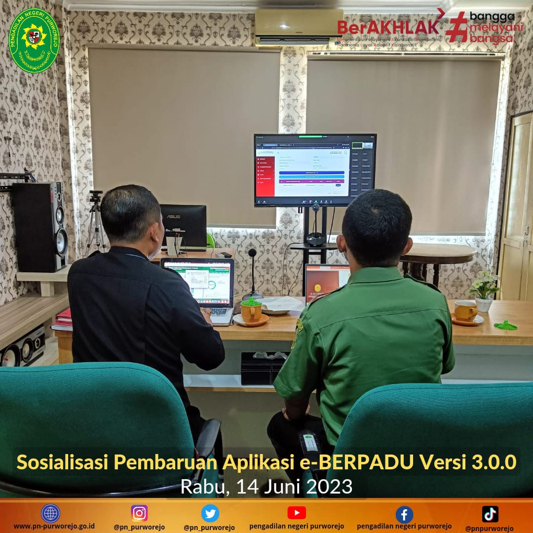 Purworejo, 14 Juni 2023. Wakil Ketua Pengadilan Negeri Purworejo Bapak Santonius Tambunan, S.H., M.H. beserta staf mengikuti Sosialisasi Pembaruan Aplikasi e-Berpadu versi 3.0.0 sesi kedua yang diselenggarakan secara daring oleh Biro Hukum dan Humas Badan Urusan Administrasi Mahkamah Agung RI.