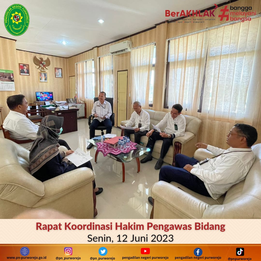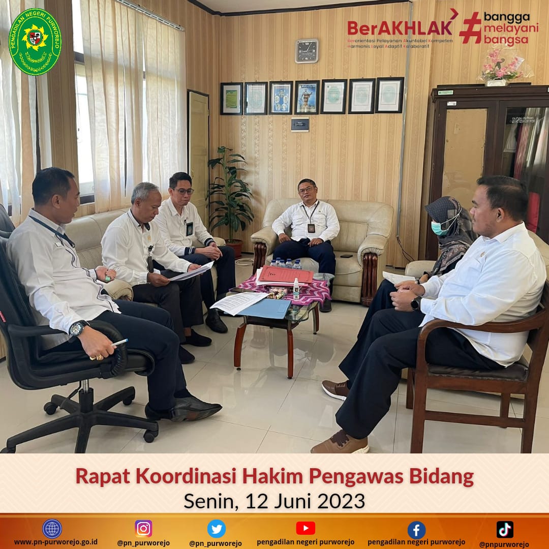 Purworejo, 12 Juni 2023. Bertempat di Ruang WKPN dalam rapat tersebut selain membahas mengenai hasil pengawasan bidang yang dilakukan Para Hakim Pengawas Bidang pada bulan Mei 2023 juga membahas mengenai evaluasi kehadiran dan kedisiplinan Hakim Bulan Mei 2023 dan juga evaluasi penanganan perkara, kepatuhan dan kesesuaian penginputan data SIPP. Rapat tersebut dihadiri oleh seluruh Hakim Pengawas Bidang tanpa terkecuali.