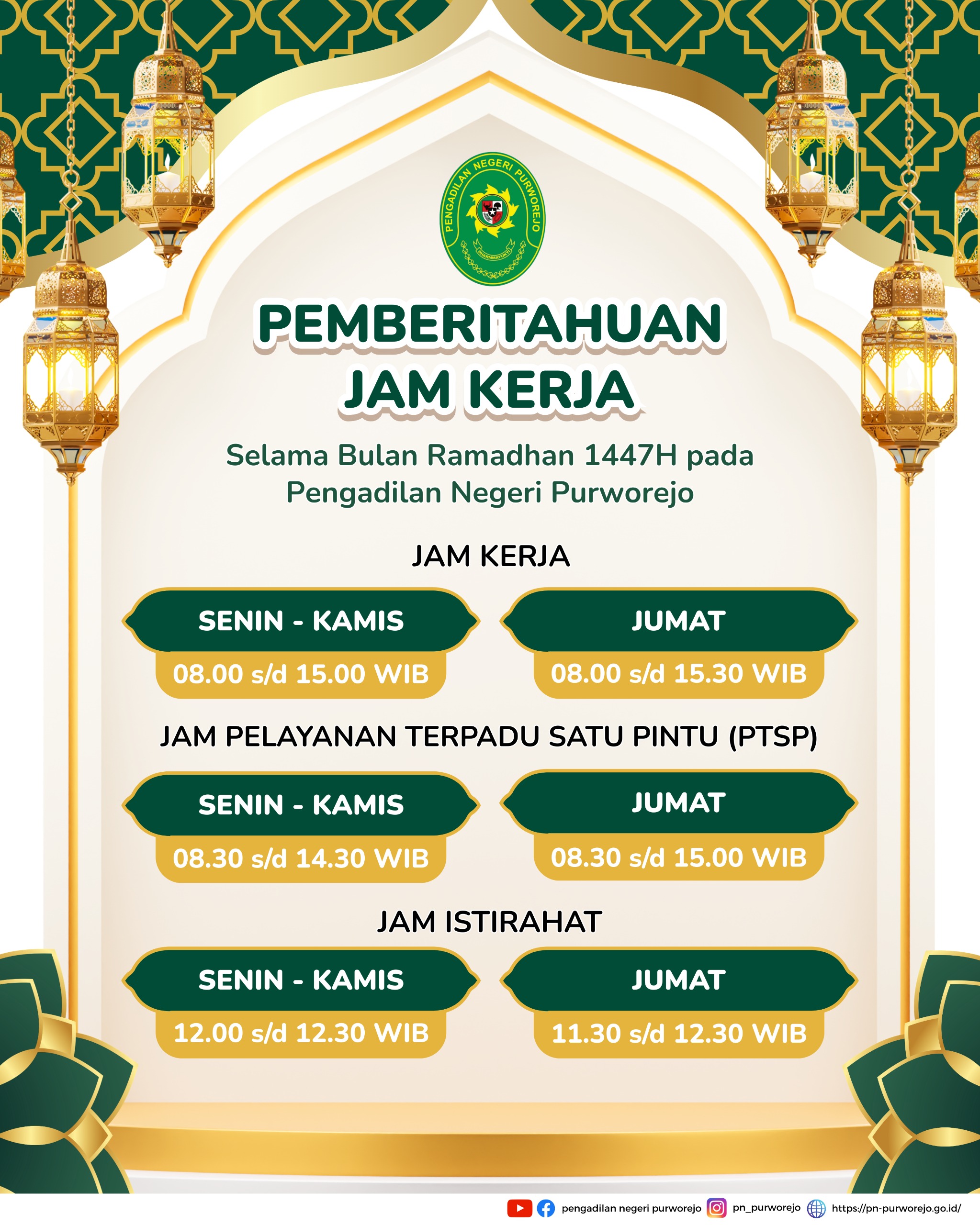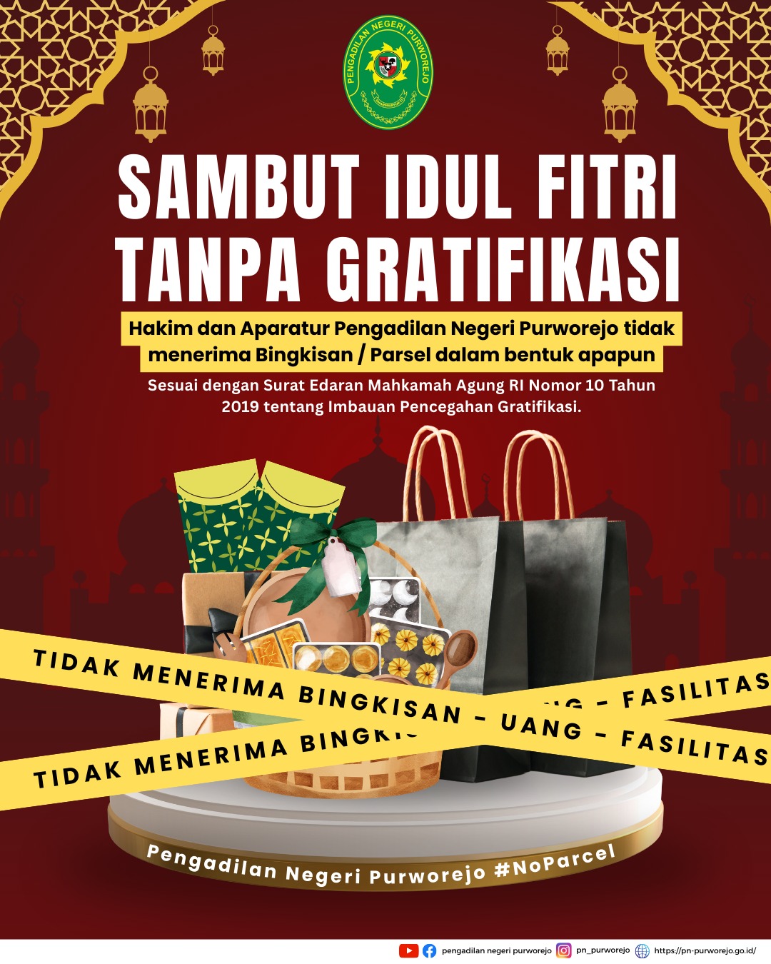 Dalam rangka menyambut Hari Raya Idul Fitri, Hakim dan Aparatur Pengadilan Negeri Purworejo berkomitmen untuk tidak menerima Bingkisan / Parsel dalam bentuk apapun sesuai dengan Surat Edaran Mahkamah Agung RI Nomor 10 Tahun 2019 tentang Imbauan Pencegahan Gratifikasi.