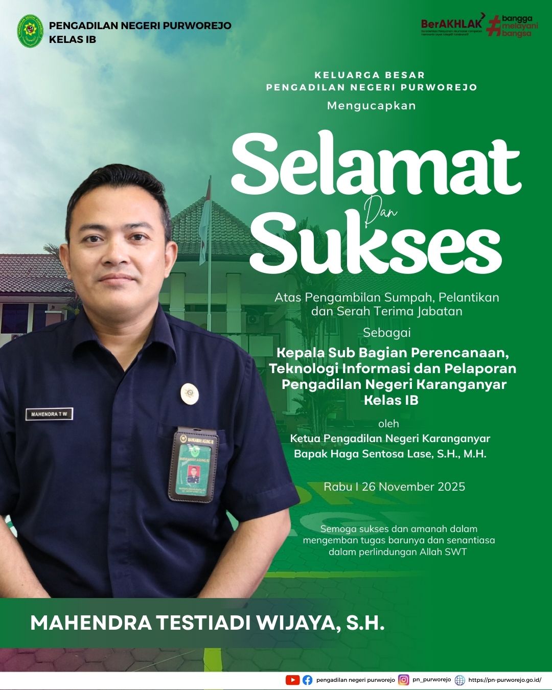 26 November 2025 Selamat dan Sukses Atas Pengambilan Sumpah, Pelantikan dan Serah Terima Jabatan Kepada Bapak Mahendra Testiadi Wijaya, S.H. sebagai Kepala Sub Bagian Perencanaan, Teknologi Informasi dan Pelaporan Pengadilan Negeri Karanganyar Kelas IB on Rabu, 26 November 2025. Posted in Pengumuman Terkini Continue Reading