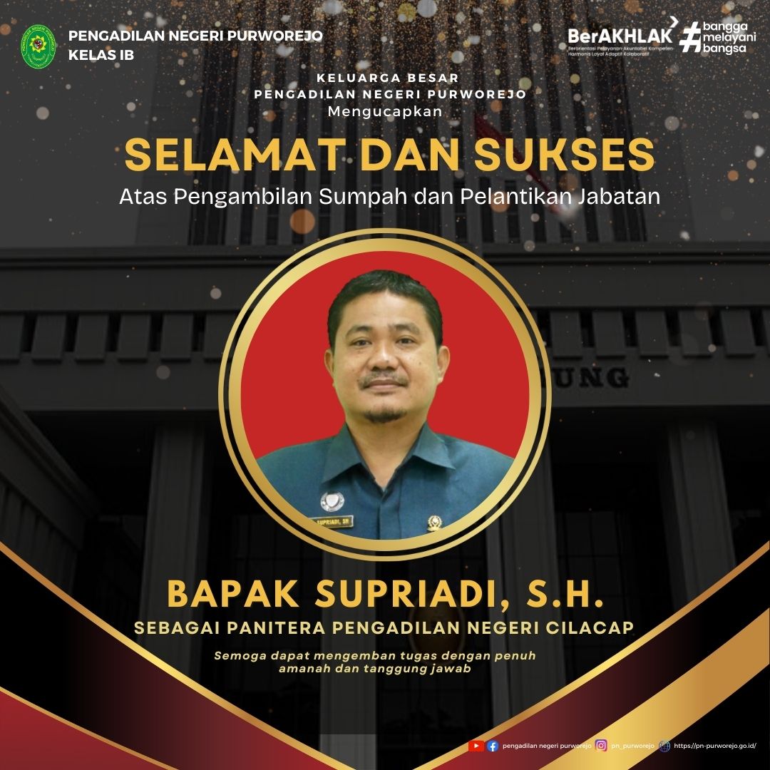 22 September 2025 Selamat dan Sukses atas Pengucapan Sumpah Jabatan dan Pelantikan Kepada Bapak Supriadi, S.H. sebagai Panitera Pengadilan Negeri Cilacap Kelas IA on Senin, 22 September 2025. Posted in Pengumuman Terkini Continue Reading