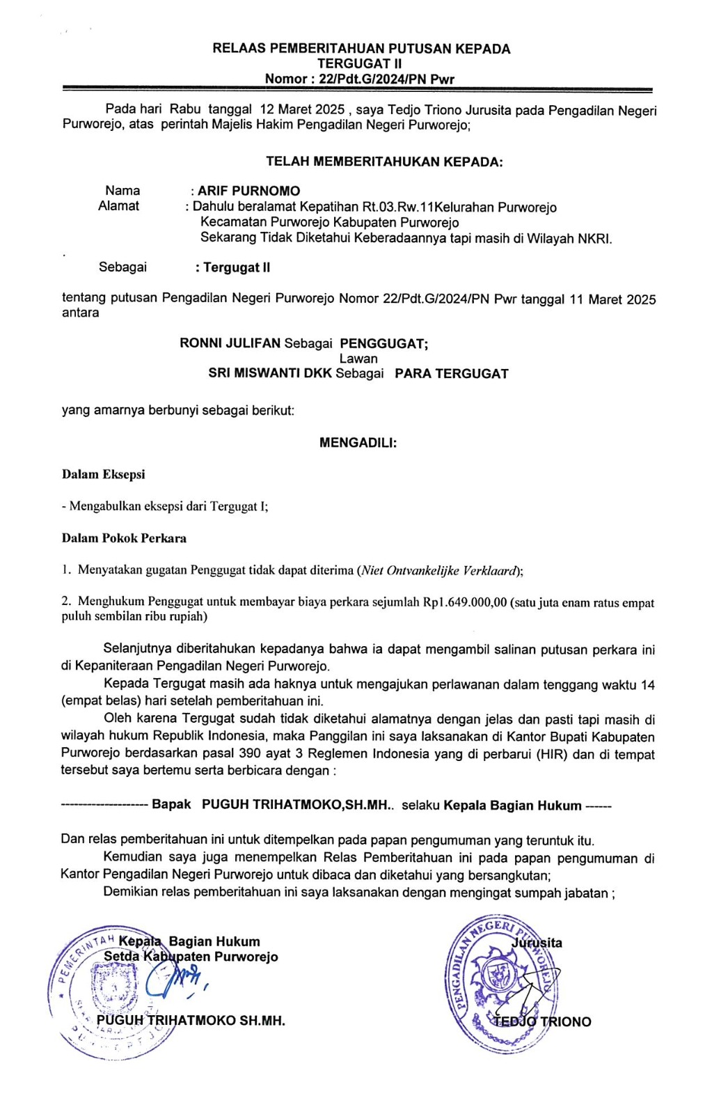 14 Maret 2025 Relaas Pemberitahuan Isi Putusan Kepada Tergugat I Nomor: 30/Pdt.G/2024/PN Pwr telah memberitahukan kepada Naziroh Dahulu tinggal di Dusun Wojo RT 002 RW 003 Desa Karangsari Kec. Purwodadi Kab Purworejo Jawa Tengah on Jumat, 14 Maret 2025. Posted in Relaas Panggilan Umum Continue Reading