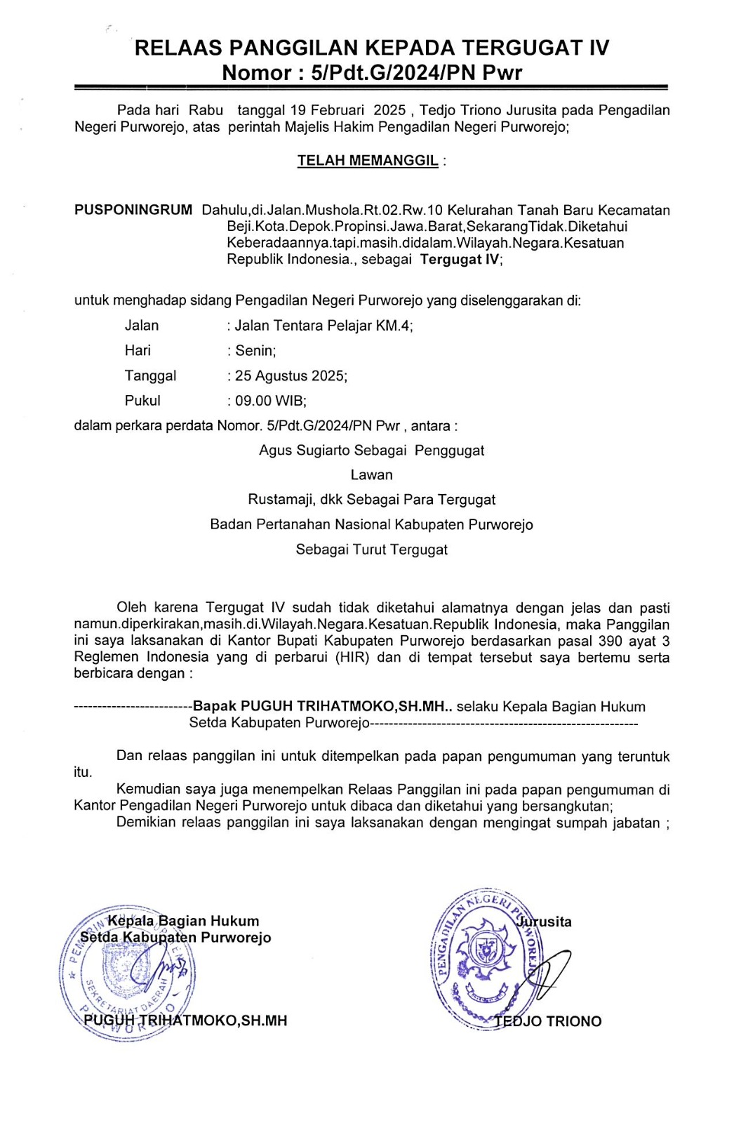 21 Februari 2025 Relaas Panggilan Kepada Tergugat IV Nomor: 5/Pdt.G/2024/PN Pwr telah memanggil kepada Pusponingrum Dahulu tinggal di Jalan Mushola RT 02 RW 10 Kel. Tanah Baru Kec. Beji Kota Depok, Jawa Barat on Jumat, 21 Februari 2025. Posted in Relaas Panggilan Umum Continue Reading