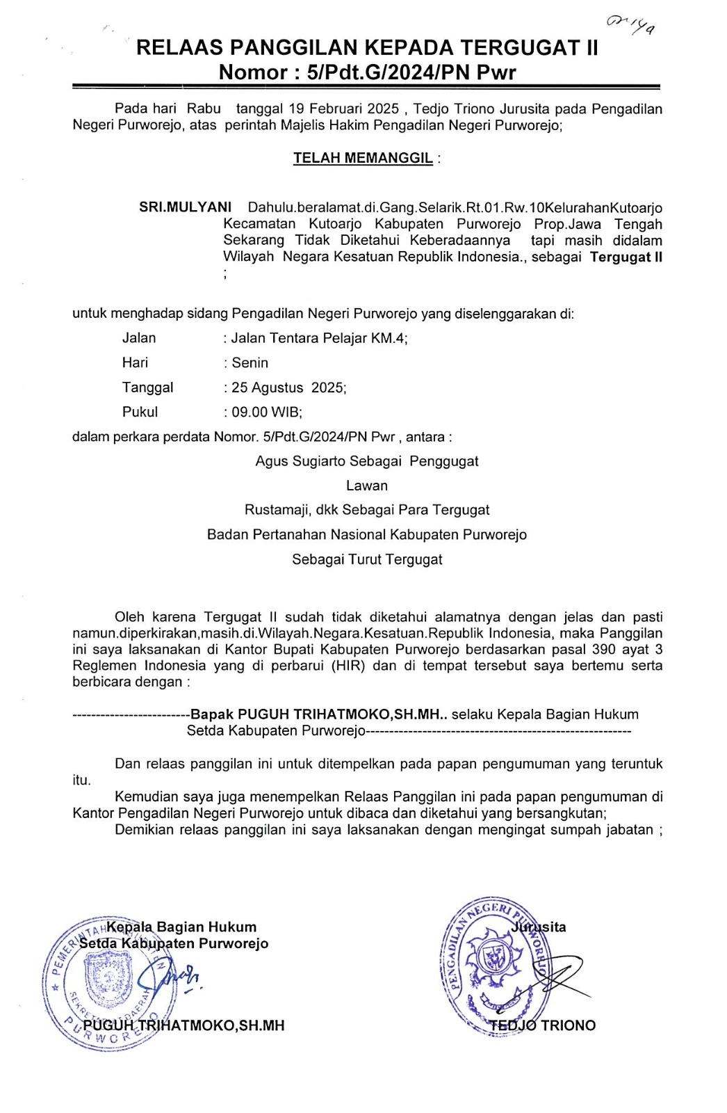 21 Februari 2025 Relaas Panggilan Kepada Tergugat II Nomor: 5/Pdt.G/2024/PN Pwr telah memanggil kepada Sri Mulyani Dahulu tinggal di Gang Selarik RT 01 RW 10 Kel. Kutoarjo Kec. Kutoarjo Kab Purworejo Jawa Tengah on Jumat, 21 Februari 2025. Posted in Relaas Panggilan Umum Continue Reading