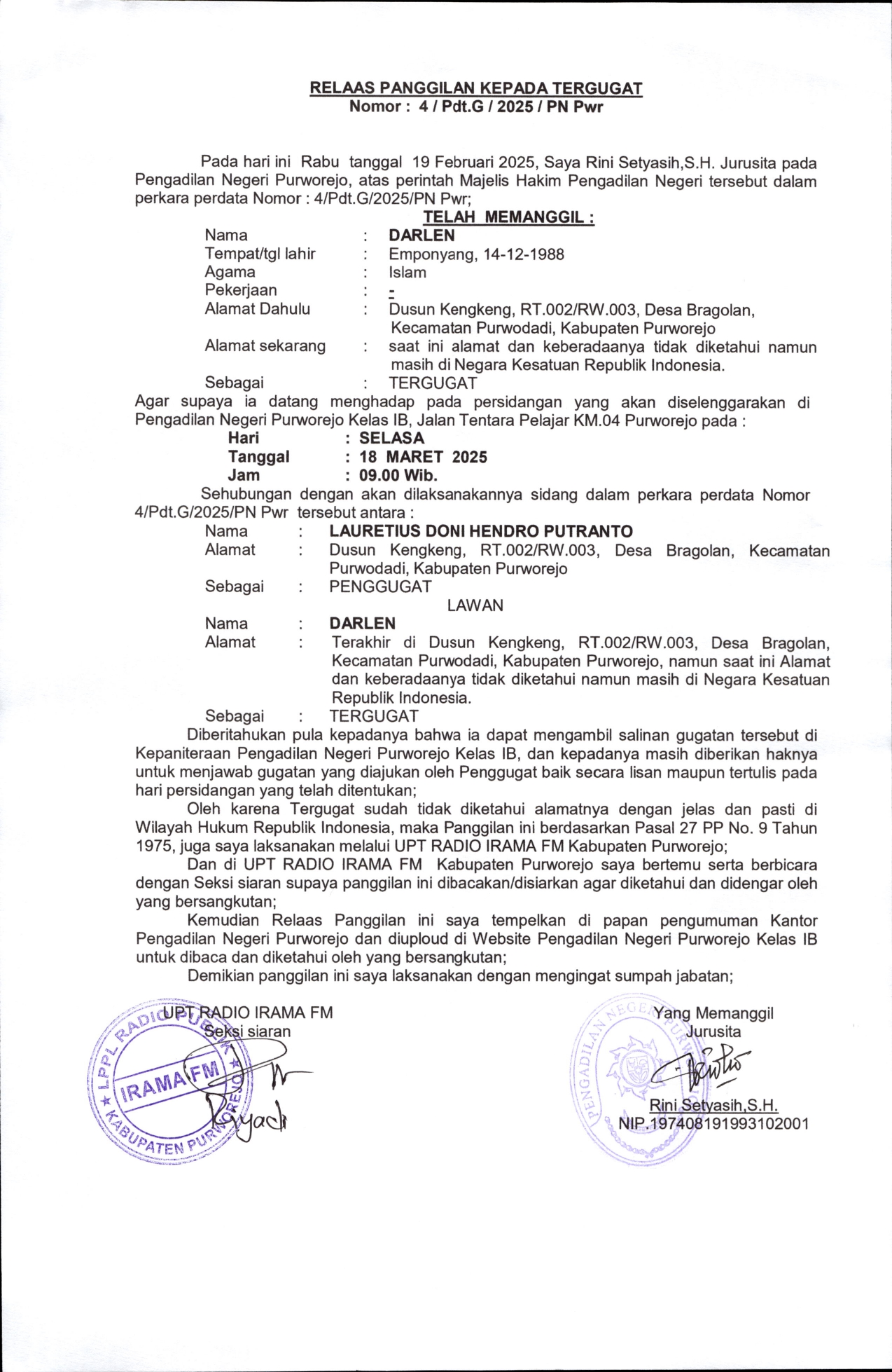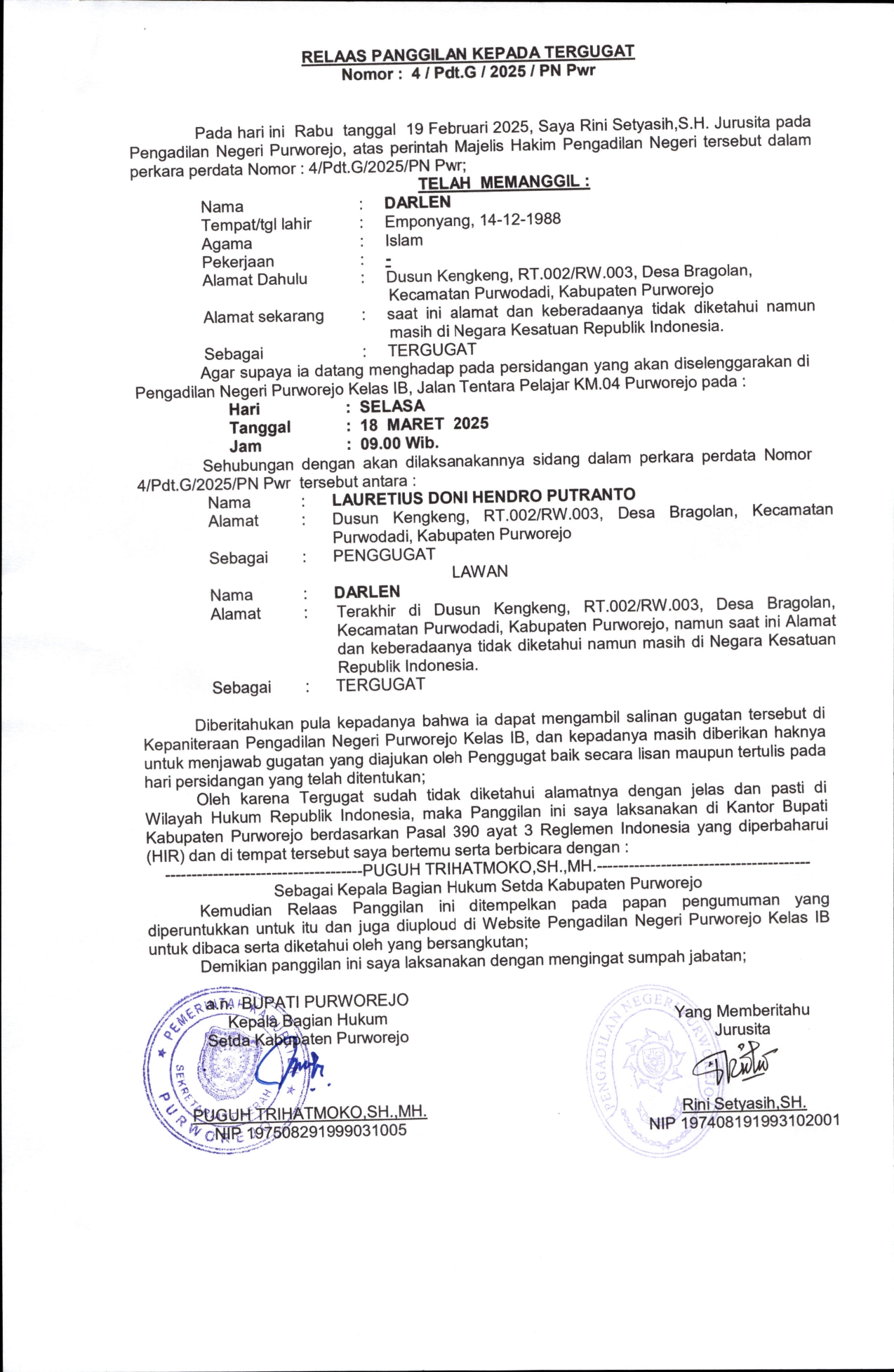 21 Februari 2025 Relaas Panggilan Kepada Tergugat Nomor: 4/Pdt.G/2025/PN Pwr telah memberitahukan kepada Darlen bertempat tinggal Dahulu tinggal di Dusun Kengkeng RT 002 RW 003 Desa Bragolan, Kec Purwodadi, Kabupaten Purworejo on Jumat, 21 Februari 2025. Posted in Relaas Panggilan Umum Continue Reading