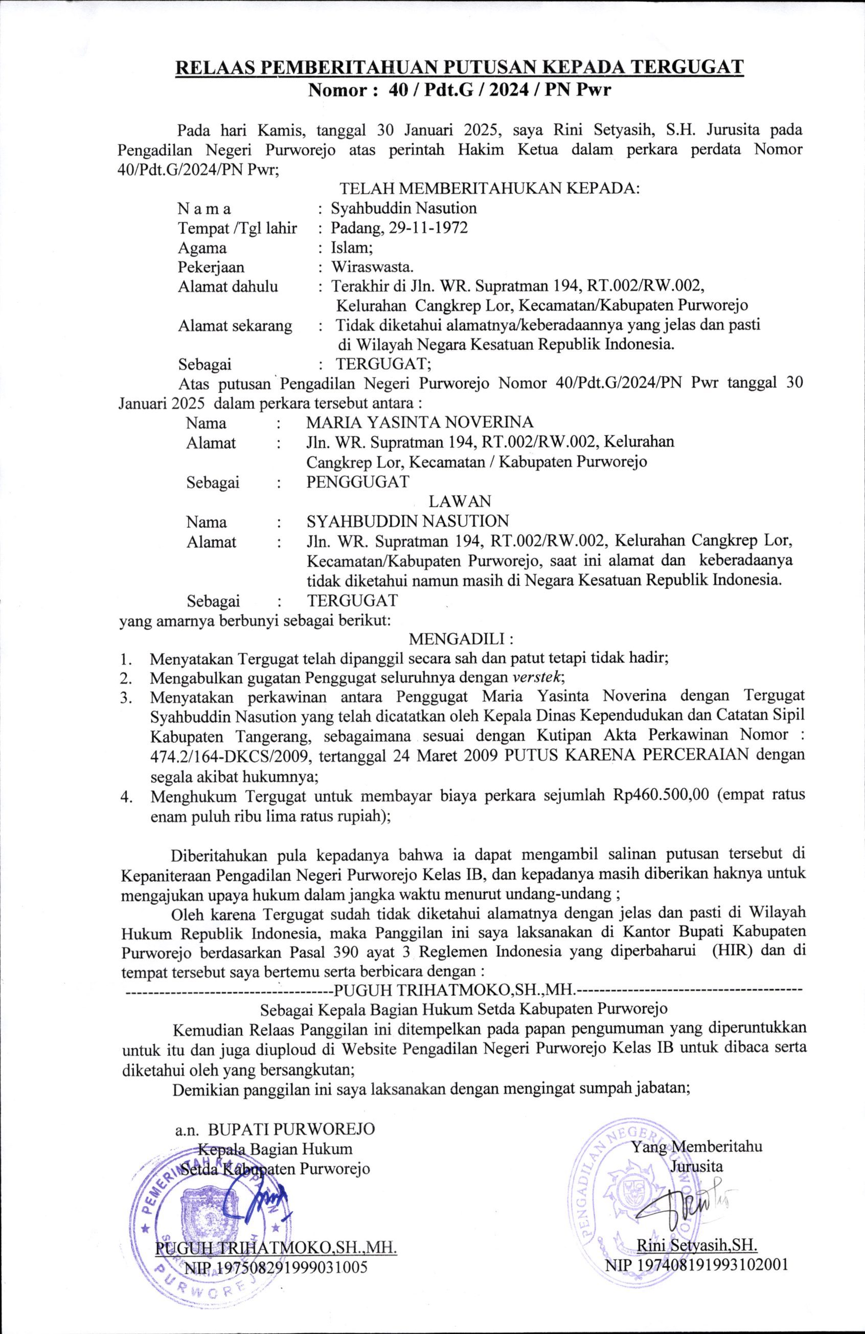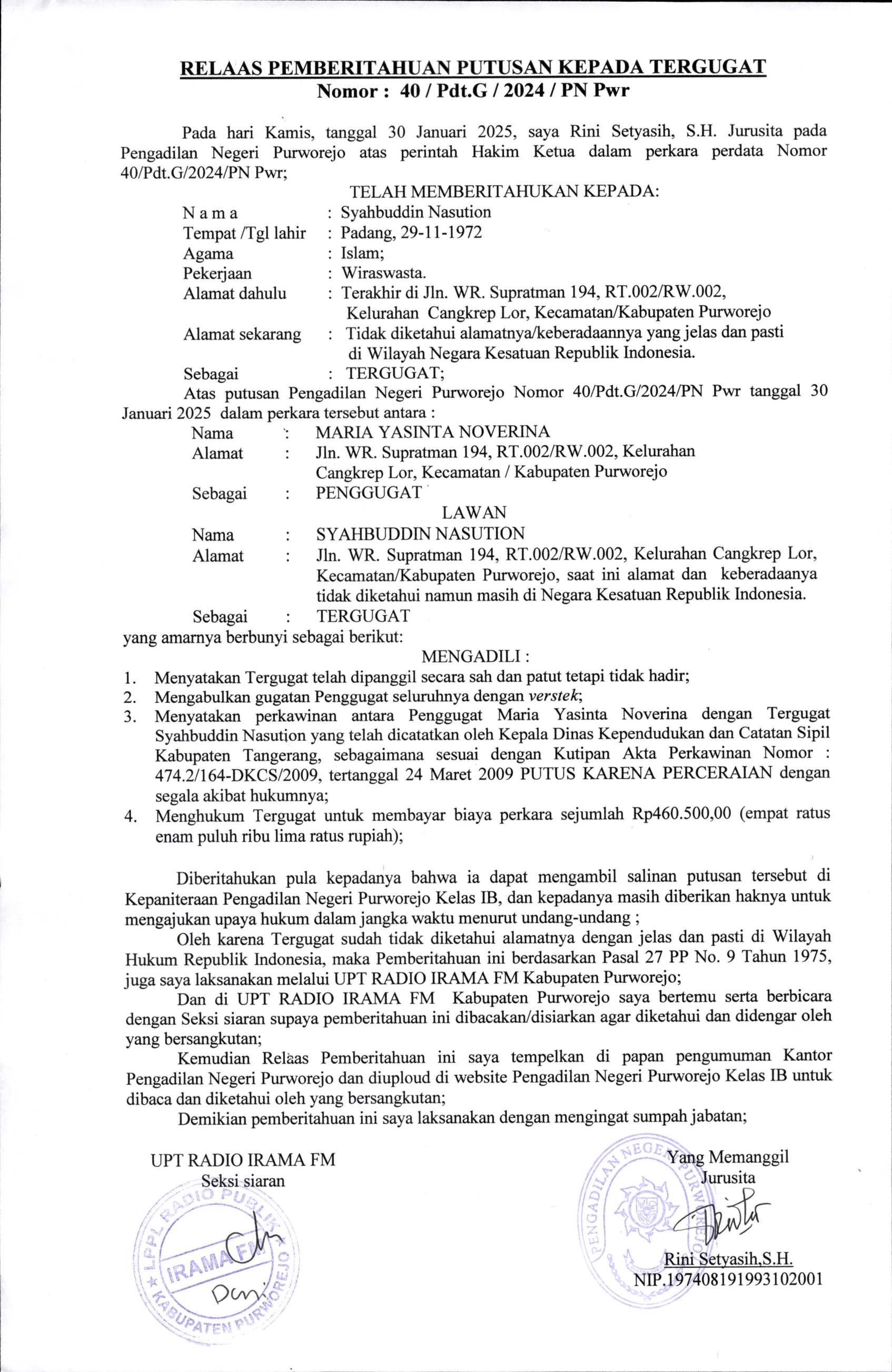 04 Februari 2025 Relaas Pemberitahuan Putusan Kepada Tergugat Nomor 40/Pdt.G/2024/PN Pwr Telah Memberitahukan Kepada Syahbuddin Nasution, Alamat Dahulu Jalan WR. Supratman 194 RT 02 RW 02, Kelurahan Cangkrep Lor Kec. Purworejo, Kab. Purworejo on Selasa, 04 Februari 2025. Posted in Relaas Panggilan Umum Continue Reading