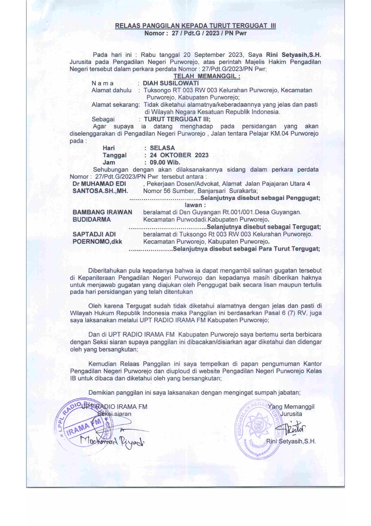 21 September 2023 Relaas Panggilan Kepada Turut Tergugat III dalam perkara perdata Nomor: 27/Pdt.G/2023/PN Pwr Telah Memanggil Diah Susilowati Beralamat di Tuksongo RT 003 RW 003 Kelurahan Purworejo, Kecamatan Purworejo, Kabupaten Purworejo on Kamis, 21 September 2023. Posted in Relaas Panggilan Umum Continue Reading
