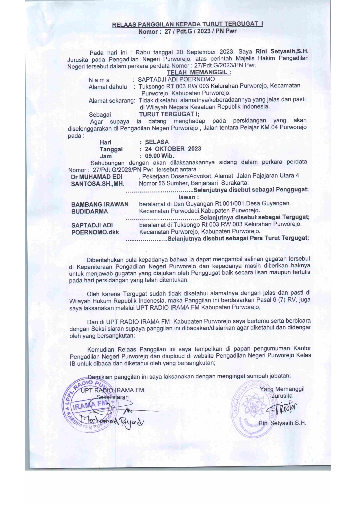 21 September 2023 Relaas Panggilan Kepada Turut Tergugat I dalam perkara perdata Nomor: 27/Pdt.G/2023/PN Pwr Telah Memanggil Saptadji Adi Poernomo Beralamat di Tuksongo RT 003 RW 003 Kelurahan Purworejo, Kecamatan Purworejo, Kabupaten Purworejo on Kamis, 21 September 2023. Posted in Relaas Panggilan Umum Continue Reading